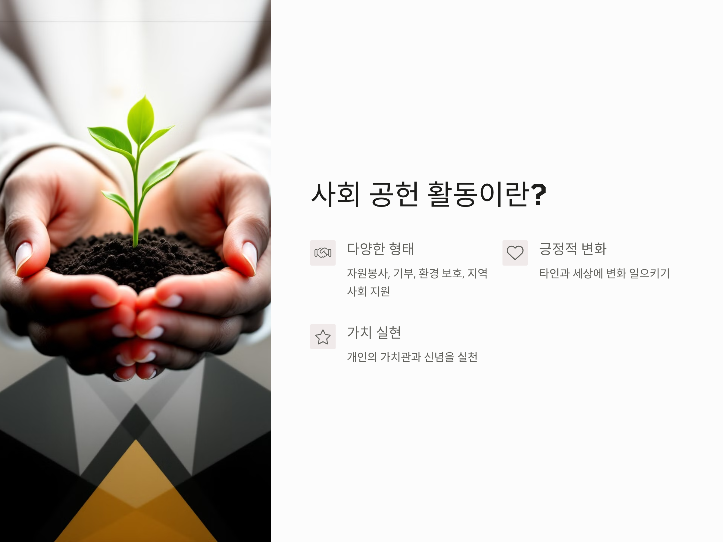 사회 공헌 활동이란, 내가 속한 사회에서 필요한 다양한 분야에서 도움을 주는 활동을 말합니다. 자원봉사, 기부, 환경 보호, 지역사회 지원 등 다양한 형태가 있으며, 그 활동을 통해 사람들은 타인과 세상에 긍정적인 변화를 일으킬 수 있습니다. 사회 공헌 활동은 특히 개인의 가치관과 신념을 실천에 옮길 수 있는 기회를 제공하며, 나아가 나의 삶을 풍요롭고 의미 있게 만들어줍니다.