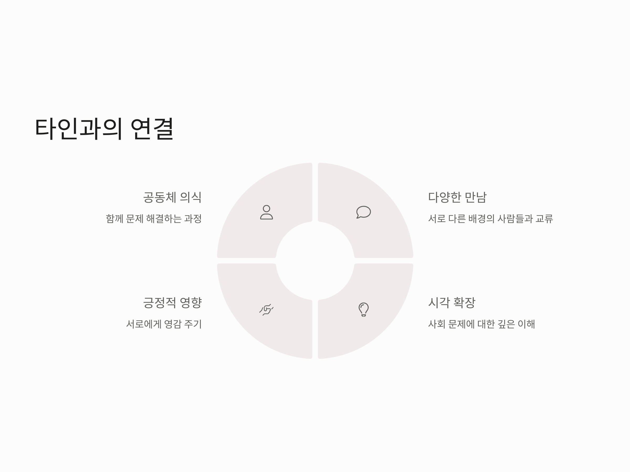 사회 공헌 활동에서 보람을 느끼는 중요한 요소 중 하나는 '타인과의 연결'입니다. 혼자서만 활동하는 것보다는 다른 사람들과 함께 협력하면서 활동을 진행할 때 더 큰 의미와 성취감을 느낄 수 있습니다. 공동체의 일원으로서 다른 사람들과 함께 문제를 해결해 나가는 과정에서 우리는 단순히 도움을 주는 것 이상의 가치를 발견하게 됩니다.