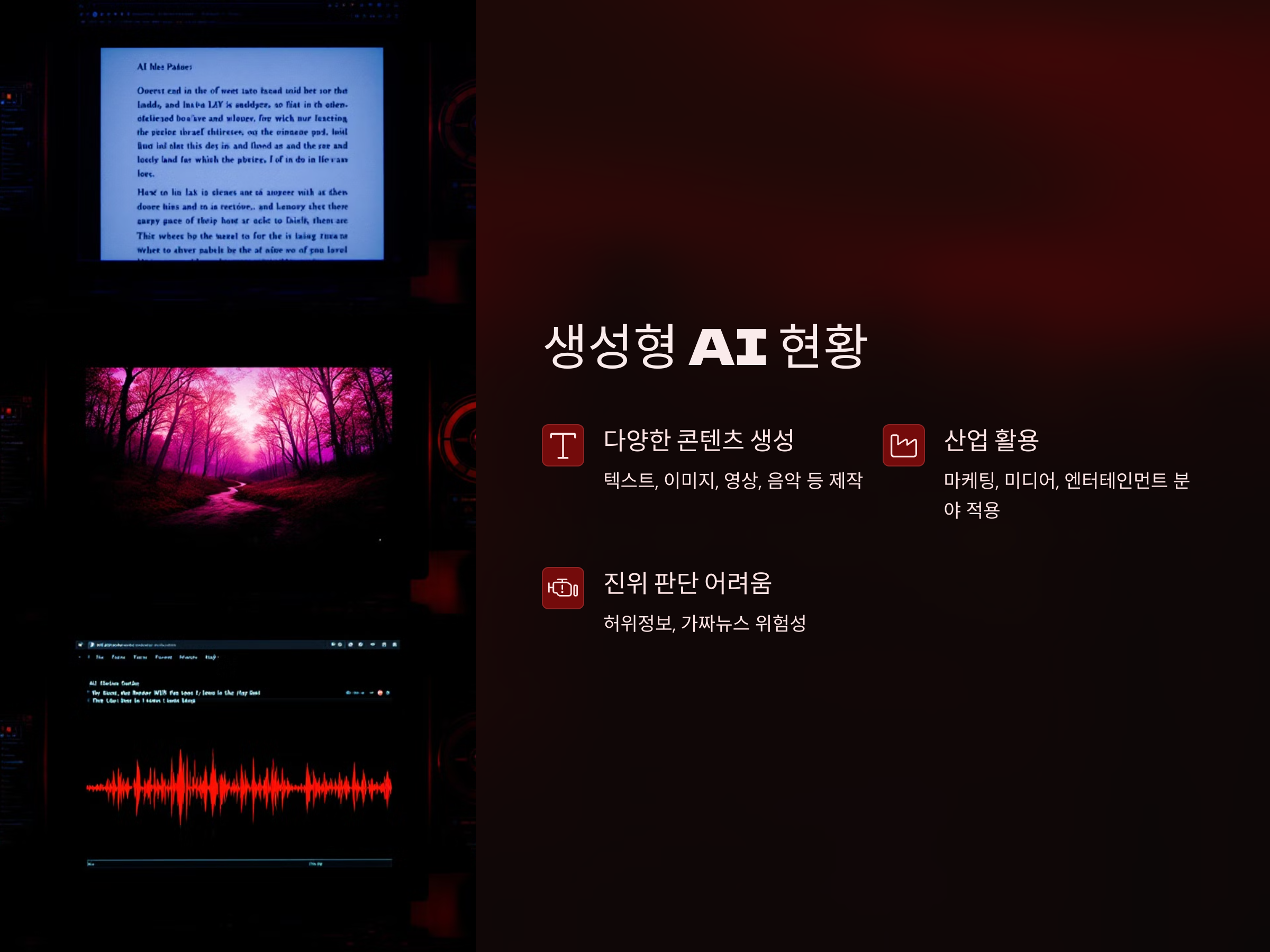하지만 AI가 생성하는 콘텐츠는 그 진위 여부를 쉽게 판단하기 어려운 특성을 가지고 있습니다. AI가 만든 글이나 이미지는 인간이 만든 것과 구분하기 어려울 수 있으며, 이는 허위 정보나 가짜 뉴스의 생산을 촉진할 수 있는 위험을 내포하고 있습니다. 이러한 문제는 AI의 활용이 본격화되면서 더욱 두드러지게 나타나고 있으며, 이에 대한 규제 필요성이 대두되고 있습니다.