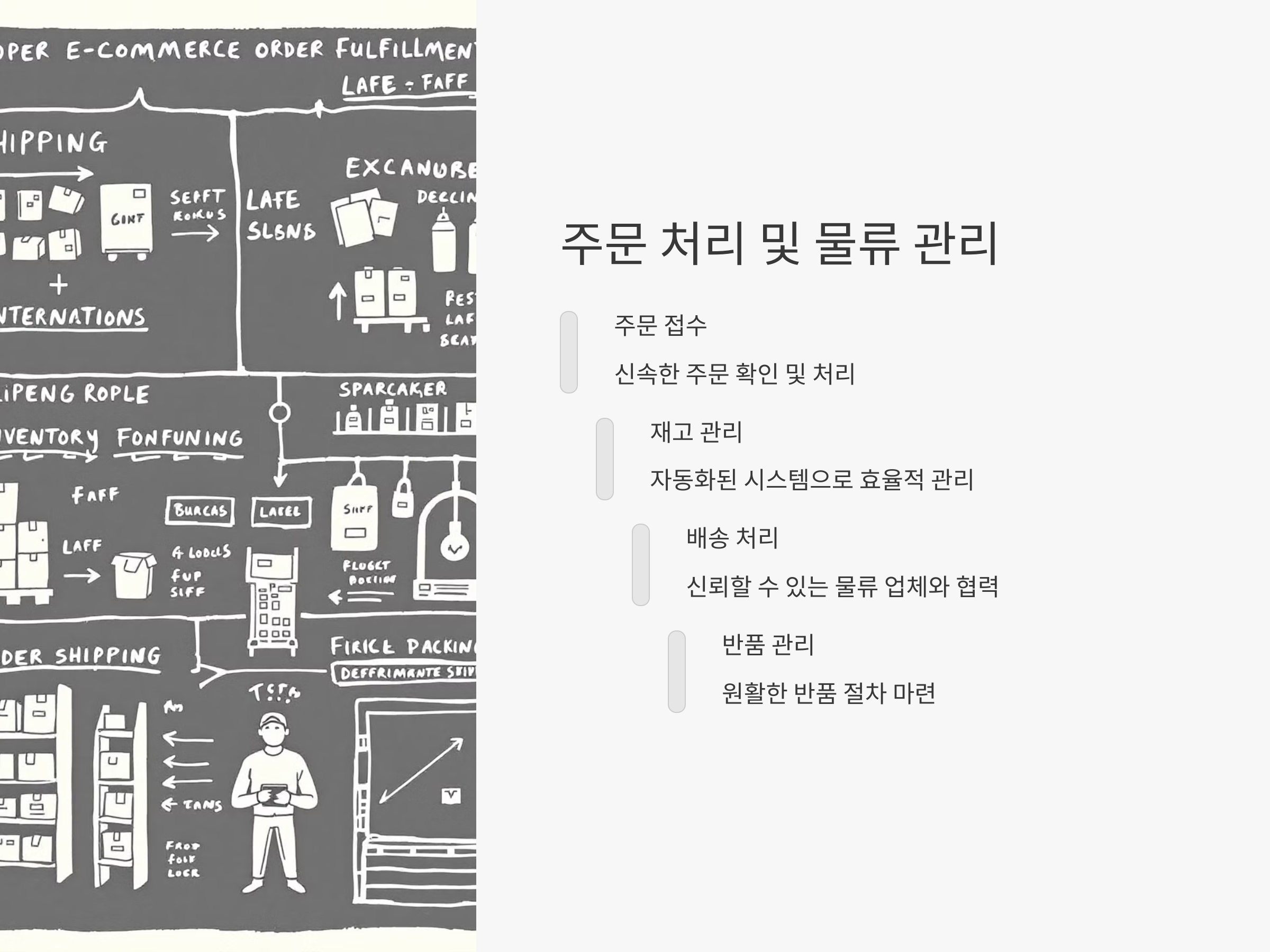 쇼핑몰 운영의 또 다른 중요한 부분은 주문 처리 및 물류 관리입니다. 고객이 주문을 하면 빠르고 정확하게 상품을 배송해야 하므로, 이를 위해 신뢰할 수 있는 물류 업체와 협력하는 것이 필요합니다. 물류 시스템은 배송 시간, 배송 비용, 반품 처리 등 다양한 요소에 영향을 미칩니다.