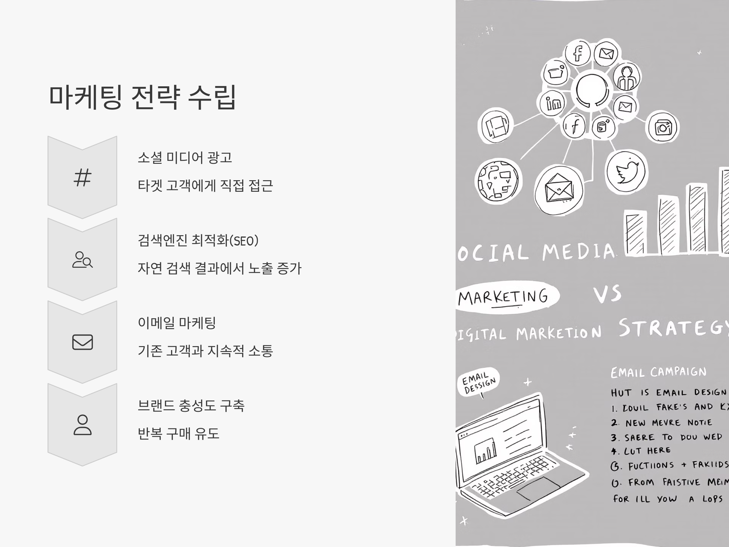 소규모 온라인 쇼핑몰이 성공하기 위해서는 마케팅 전략이 반드시 필요합니다. 고객이 내 쇼핑몰을 알지 못하면 판매가 이루어질 수 없습니다. 따라서, 적극적인 마케팅 활동이 필요합니다. 소셜 미디어 광고, 검색엔진 최적화(SEO), 이메일 마케팅 등 다양한 전략을 결합하여 활용할 수 있습니다.