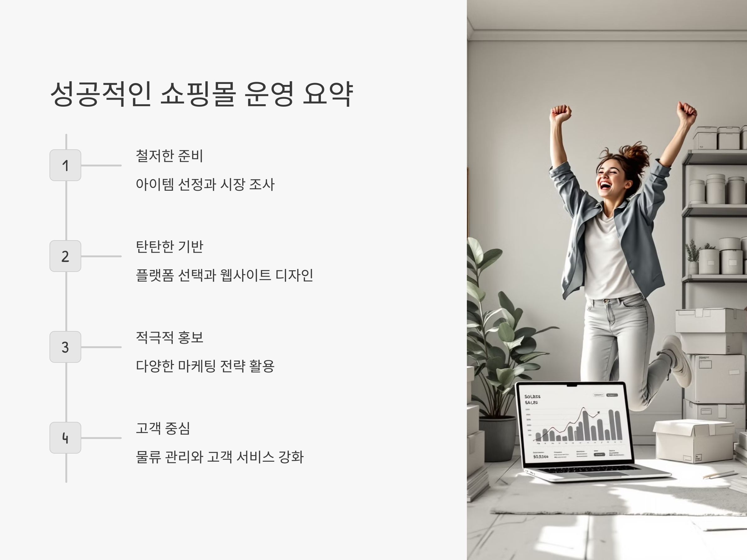 마케팅은 단기적인 성과를 기대할 수 있는 방법이지만, 브랜드 충성도를 구축하는 것이 중요합니다. 고객이 쇼핑몰을 기억하고 다시 방문하게 만들려면 지속적인 콘텐츠 마케팅과 고객 서비스가 필수적입니다. 쇼핑몰 운영 초기에는 예산을 잘 활용해 효율적인 마케팅을 진행하는 것이 중요합니다.