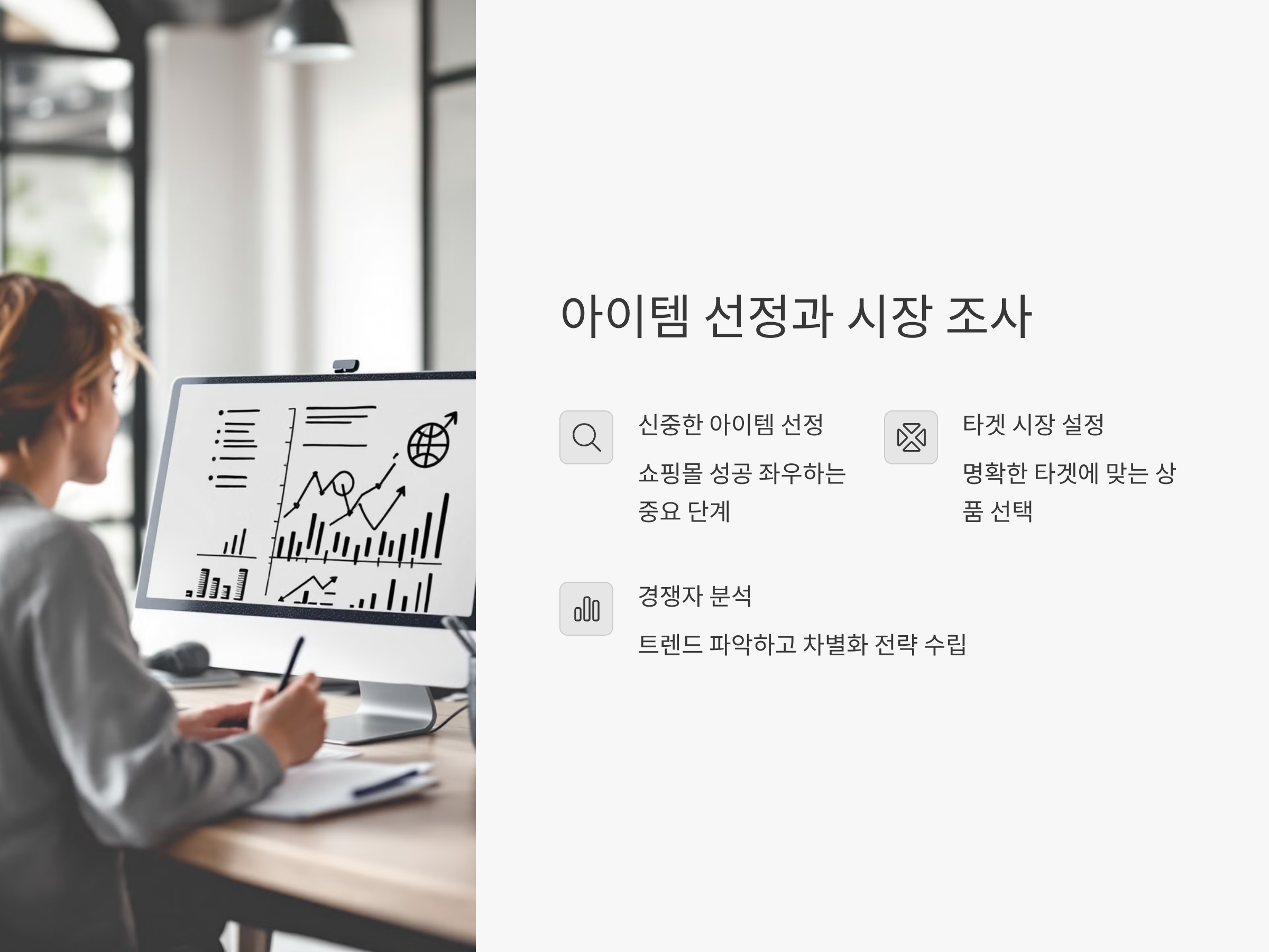 아이템을 선정한 후에는 반드시 시장 조사를 해야 합니다. 시장 조사는 단순히 상품을 고르는 것에 그치지 않습니다. 어떤 상품이 잘 팔리는지, 경쟁자는 누구인지, 소비자의 구매 패턴은 어떻게 되는지 등을 분석해야 합니다. 다양한 리서치 툴을 사용하거나, 경쟁 쇼핑몰을 분석하면서 트렌드를 파악해 보세요. 그 후, 자신의 쇼핑몰을 어떻게 차별화할지 고민해보면 됩니다.
