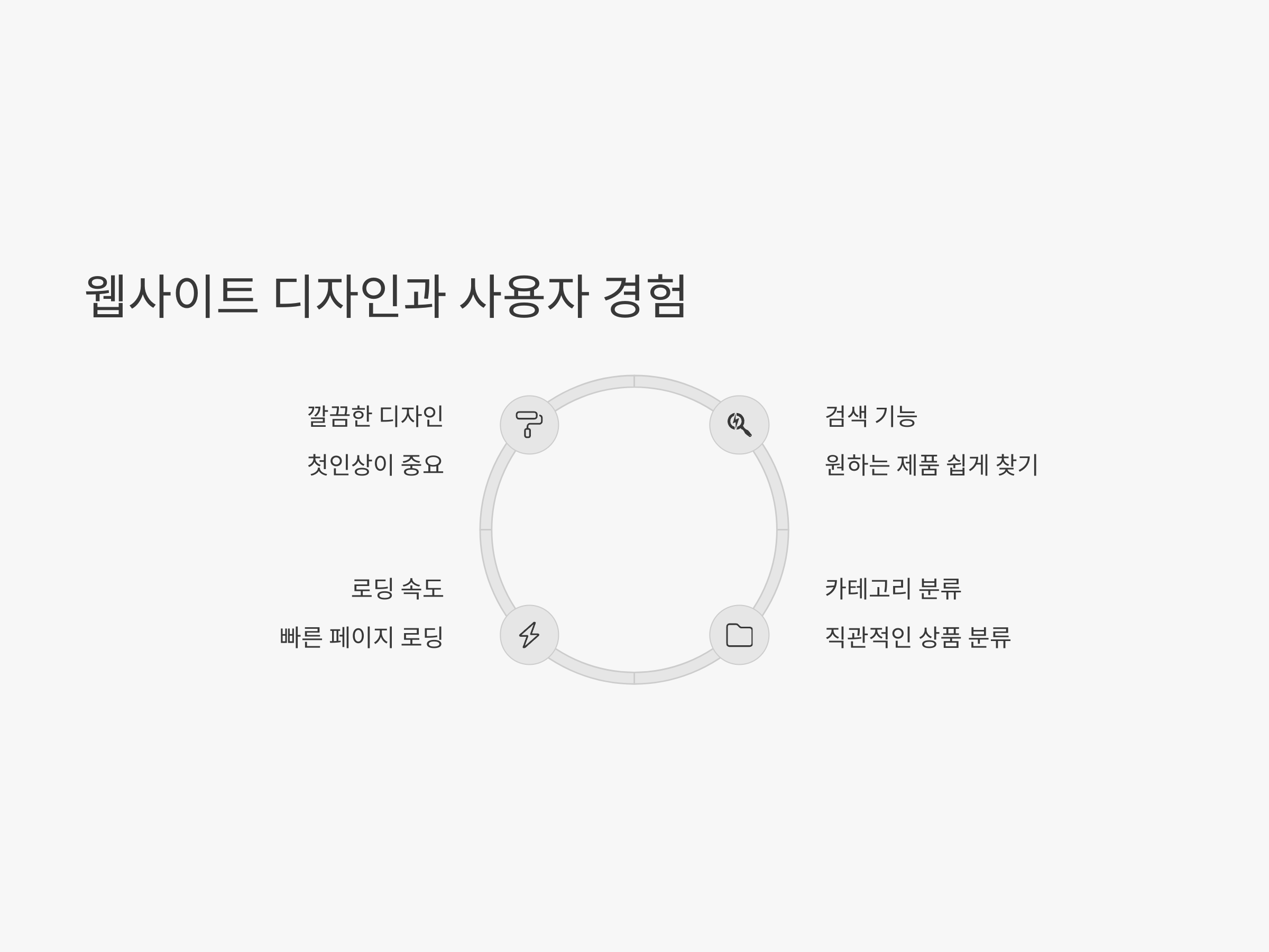 사용자 경험(UX)을 고려한 디자인이 필요합니다. 이를 위해서는 고객들이 원하는 제품을 쉽게 찾을 수 있는 검색 기능, 직관적인 카테고리 분류, 빠른 로딩 속도 등을 고려해야 합니다. 웹사이트를 처음 방문한 고객이 제품을 보고 바로 구매할 수 있도록 유도하는 것이 중요합니다. 이러한 점들은 최종적으로 매출에 영향을 미치게 됩니다.