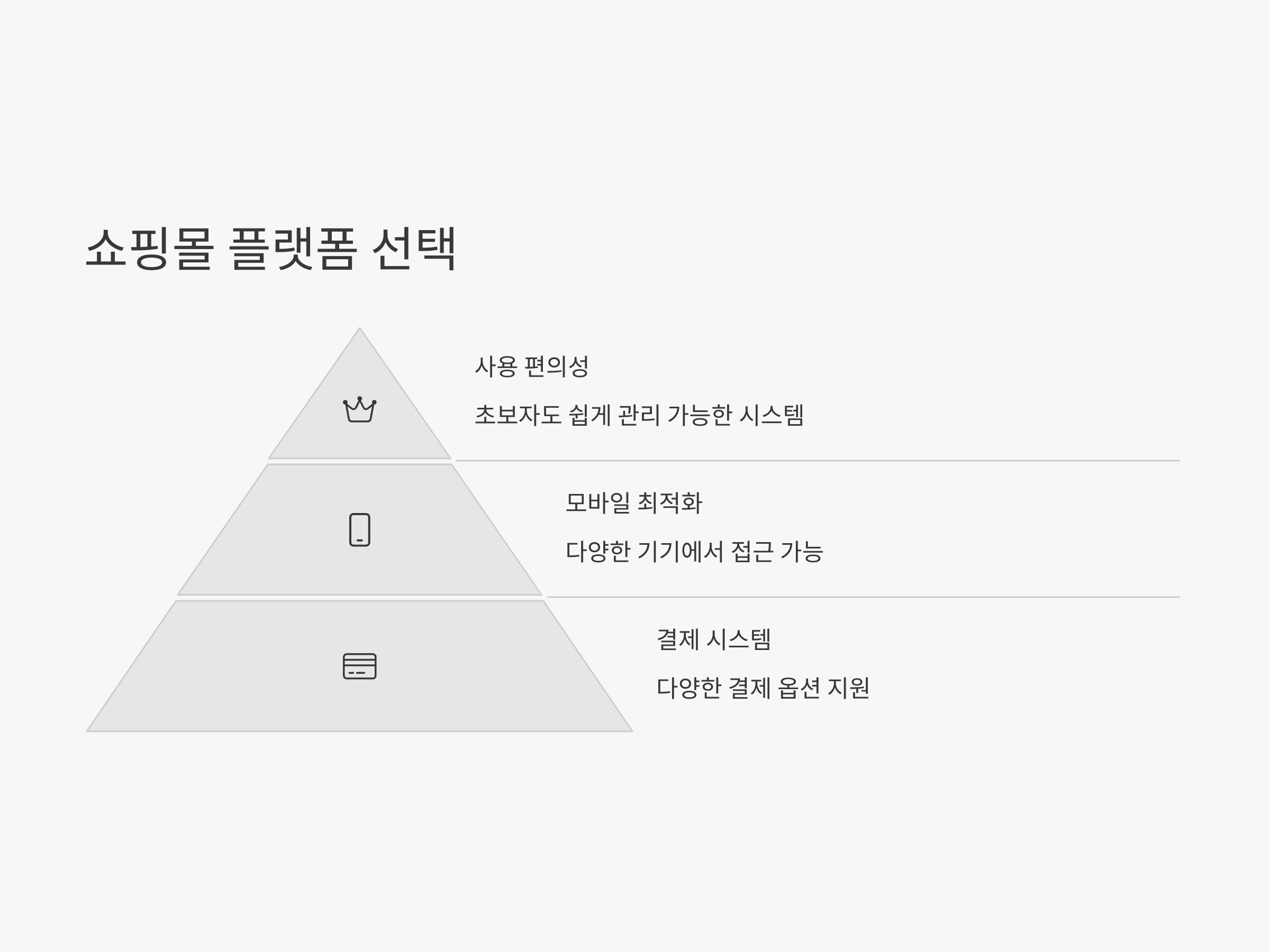 쇼핑몰 플랫폼을 선택할 때 고려해야 할 점은 사용 편의성, 지원되는 결제 시스템, 모바일 최적화, SEO 기능 등입니다. 특히 초보자라면, 관리가 용이한 플랫폼을 선택하는 것이 중요합니다. 복잡한 기술적 요소 없이도 쇼핑몰을 관리할 수 있도록 도와주는 기능들이 많기 때문입니다.