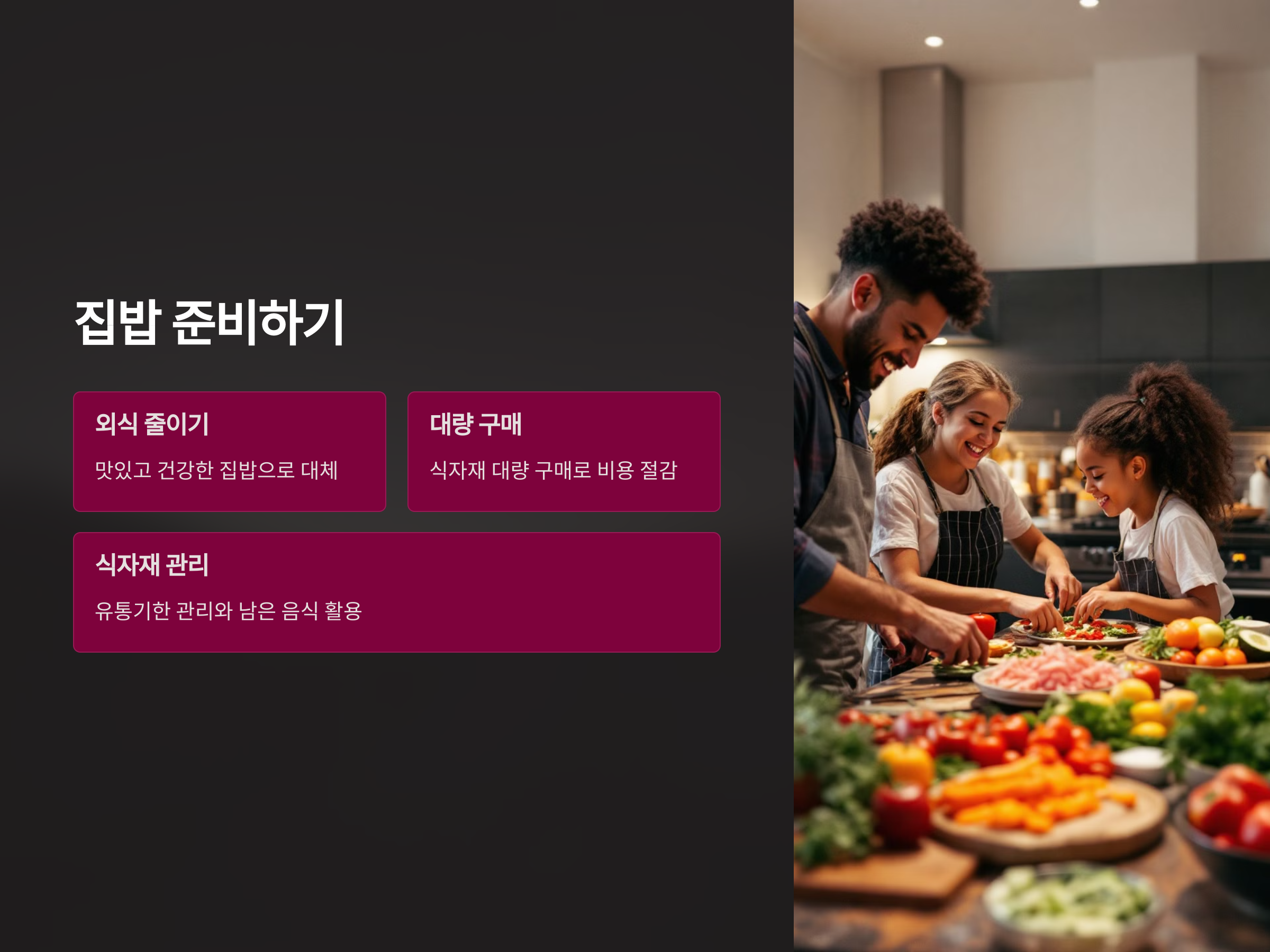 식자재를 대량으로 구매하면 비용을 절약할 수 있습니다. 또한, 냉장고와 식료품 창고를 잘 관리하여 재료가 유통기한을 지나지 않도록 하고, 남은 음식을 활용하는 습관을 들이면 불필요한 음식 낭비를 줄일 수 있습니다. 이 방법은 가족이 많은 가정에서 특히 효과적입니다.