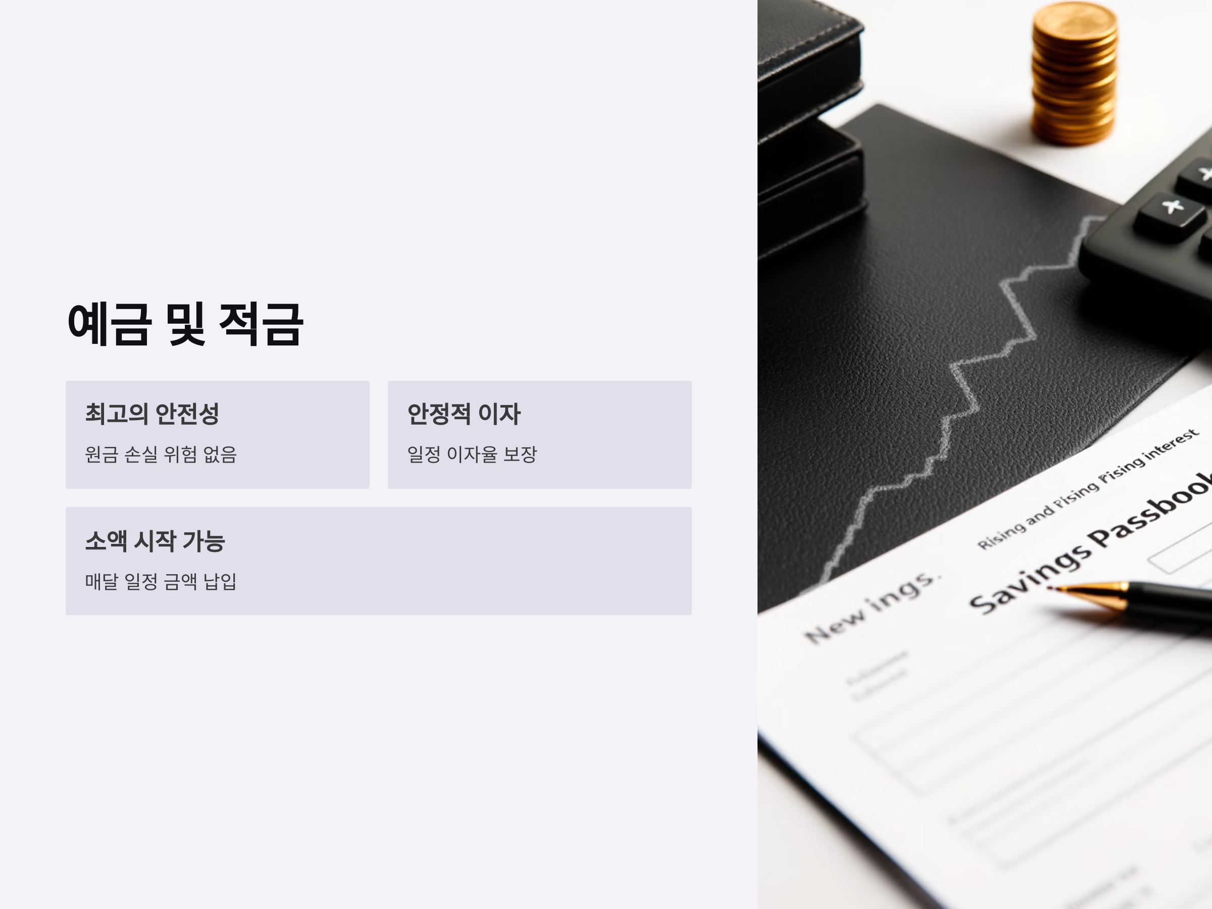 예금과 적금은 가장 기본적이면서도 안정적인 투자 방법으로 손꼽힙니다. 원금 손실의 위험이 없기 때문에 리스크가 없으며, 일정한 이자율을 통해 안정적인 수익을 얻을 수 있습니다. 특히 예금은 장기적으로 보유하면 일정한 이자가 누적되어 안정적인 수익을 추구할 수 있습니다.