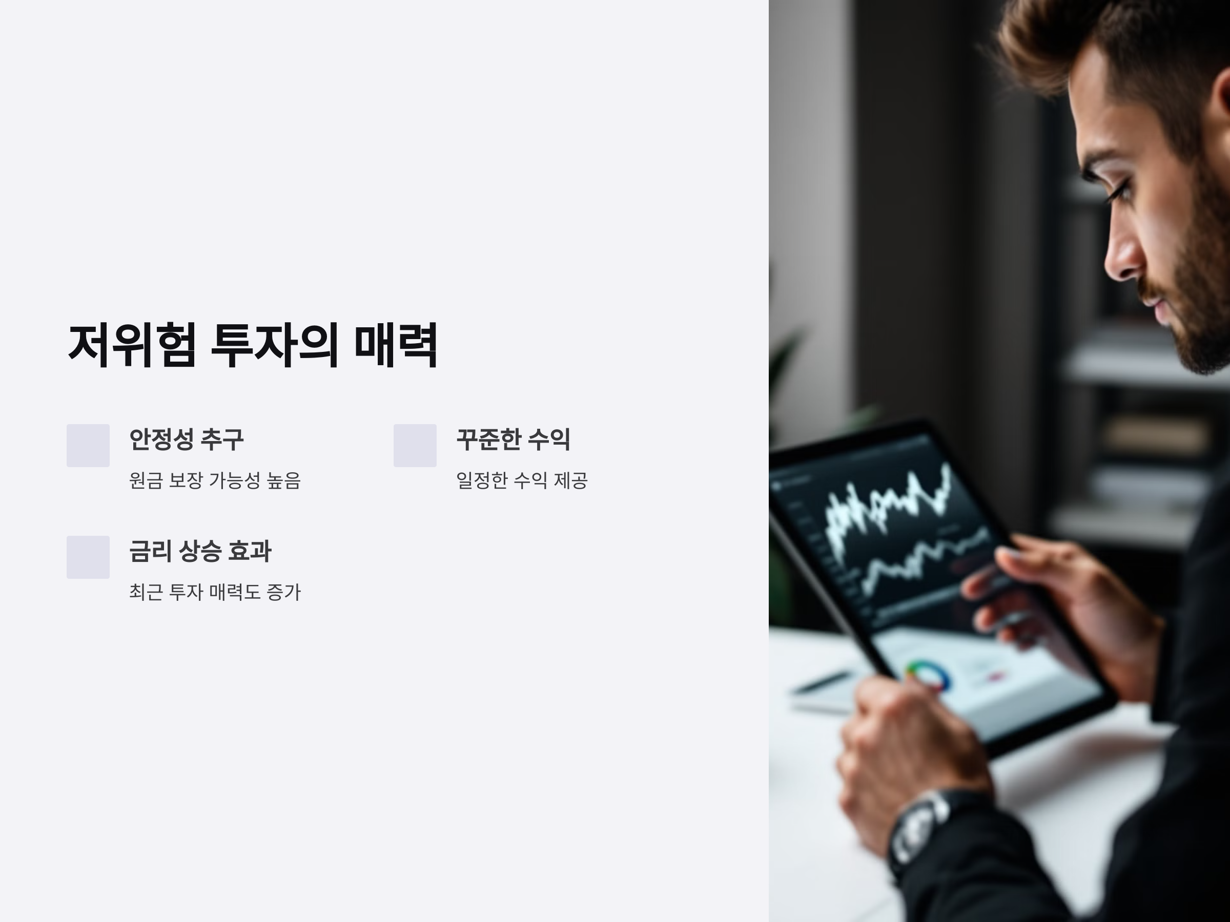 최근 금리 인상과 경제 불확실성에도 불구하고 저위험 투자는 여전히 매력적인 선택지로 남아있습니다. 특히 금리가 상승하면서, 안정적인 수익을 추구하는 사람들이 늘고 있으며, 저위험 투자는 대부분 원금을 보장받으면서도 일정한 수익을 제공합니다. 이에 따라 최근 몇 년 동안 더욱 많은 사람들이 소액으로 시작하는 저위험 투자에 눈을 돌리고 있습니다.