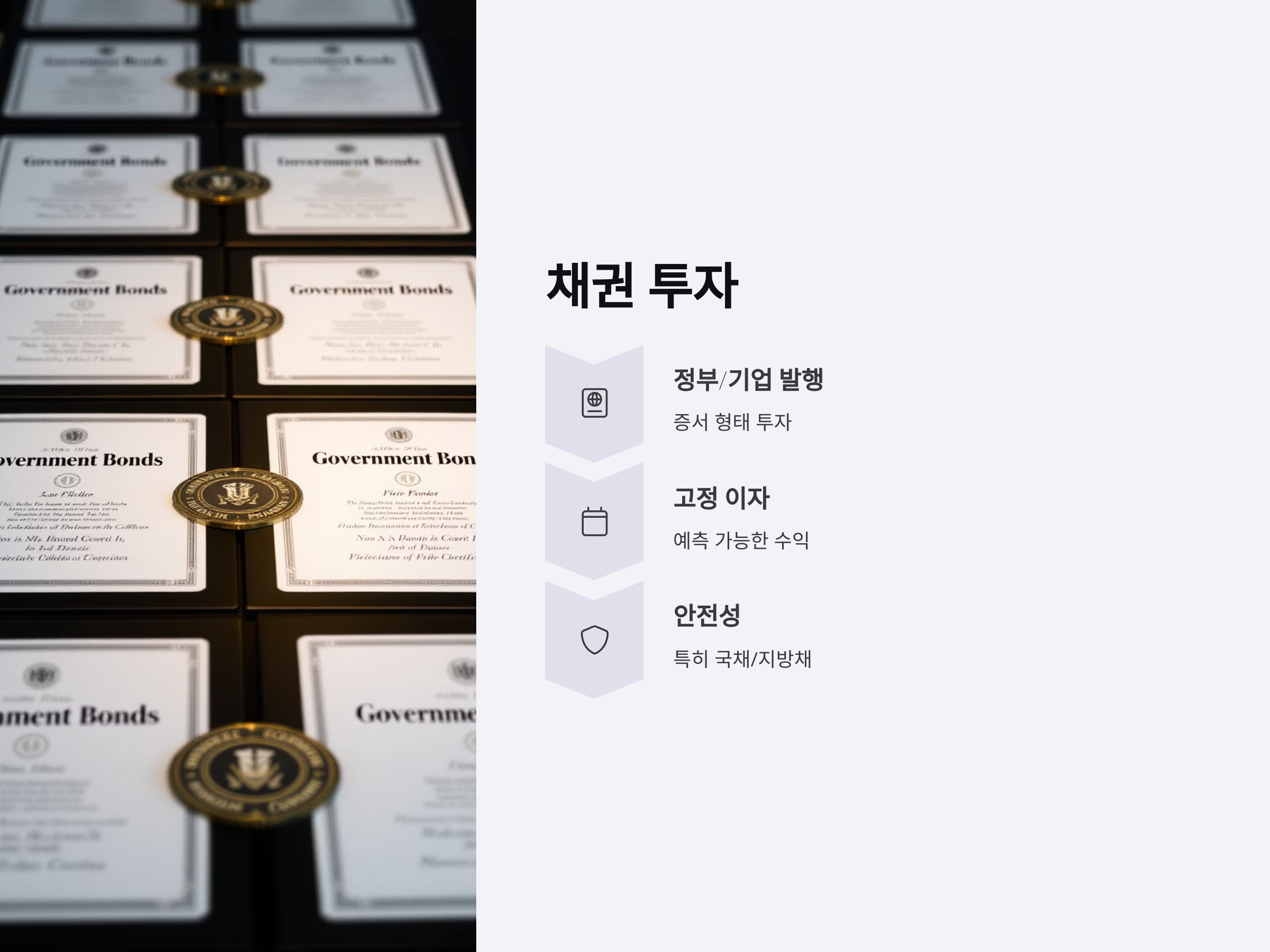 국채나 지방채와 같은 정부 발행 채권은 가장 안전한 채권으로 여겨지며, 예측 가능한 수익을 제공합니다. 하지만 채권의 이자율은 상대적으로 낮은 편이기 때문에, 큰 수익을 기대하기보다는 안정적인 수익을 목표로 투자하는 것이 좋습니다.