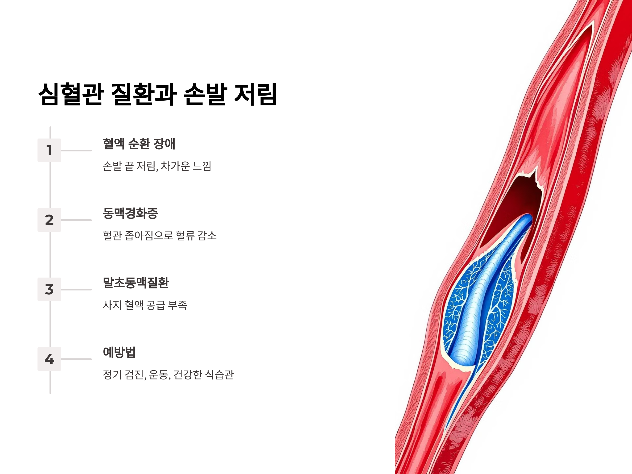 심혈관 질환으로 인한 손발 저림은 장기적인 문제가 될 수 있기 때문에 혈압, 혈당, 콜레스테롤 수치를 정기적으로 체크하고, 적절한 운동과 건강한 식습관을 유지하는 것이 중요합니다.