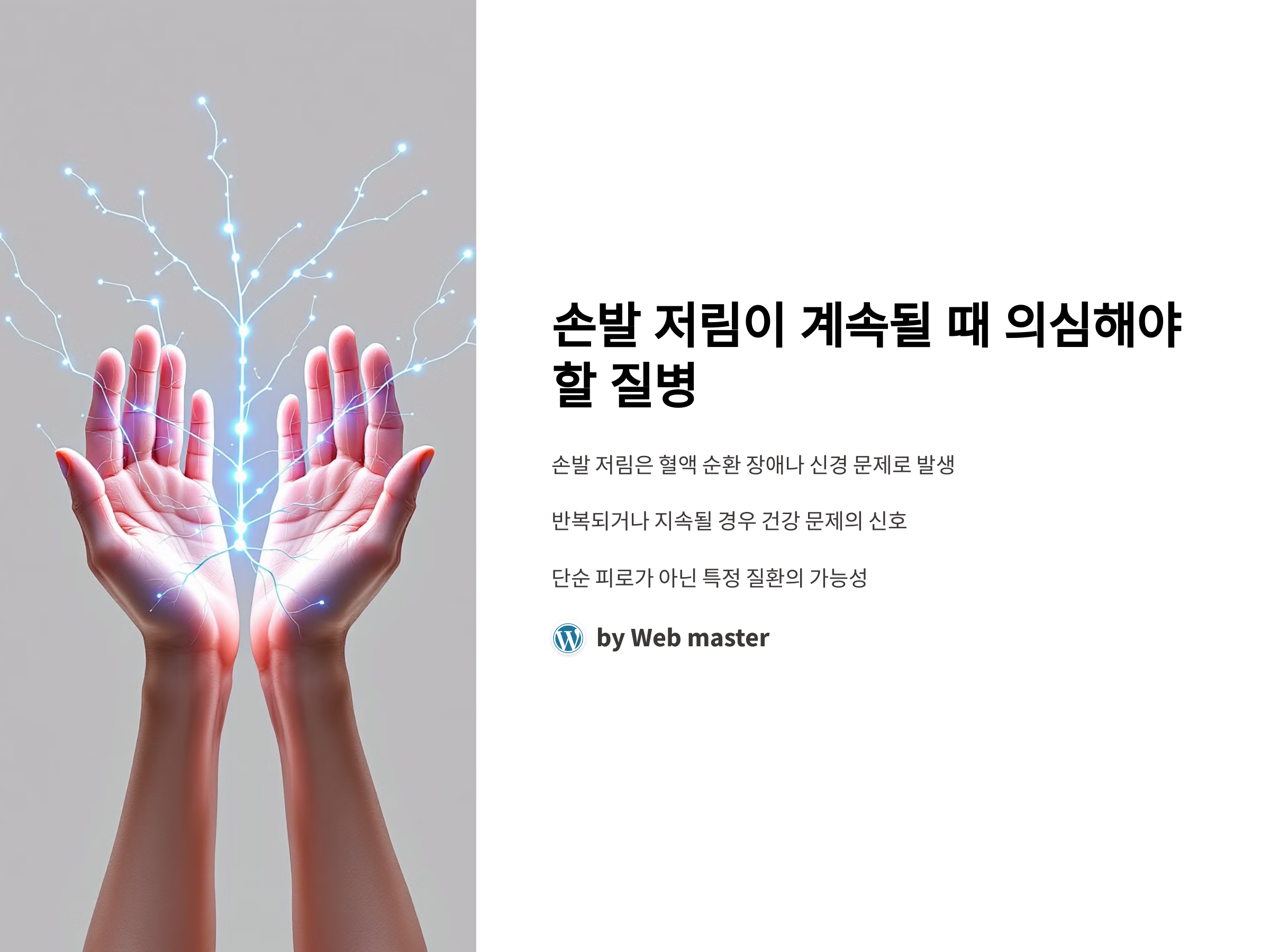손발 저림은 일반적으로 혈액 순환 장애나 신경 문제로 발생할 수 있는 증상입니다. 많은 사람들이 일시적으로 경험할 수 있지만, 이 증상이 반복되거나 지속될 경우 건강 문제의 신호일 수 있습니다. 이번 포스팅에서는 손발 저림이 계속될 때 의심해야 할 주요 질병들과 그 증상들에 대해 자세히 알아보겠습니다.