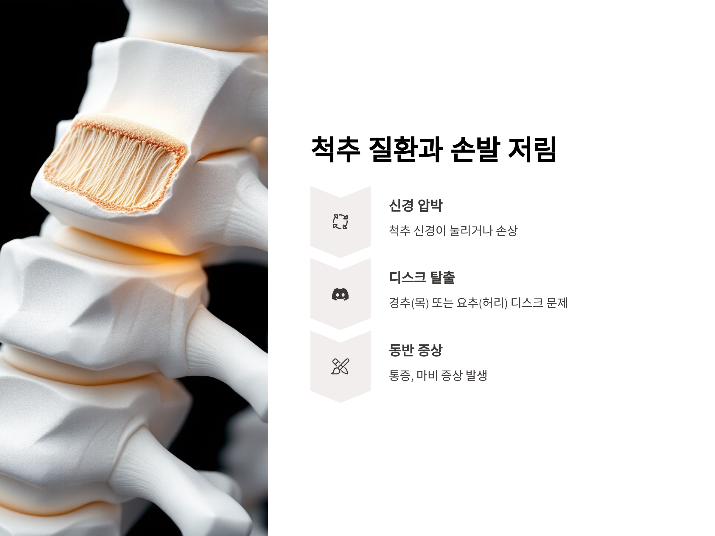 척추에 문제가 있을 때도 손발 저림 증상이 나타날 수 있습니다. 특히 척추에서 나오는 신경이 눌리거나 손상되면 신경 경로에 이상이 생기면서 손이나 발에 저림이나 통증이 발생할 수 있습니다. 이 증상은 주로 '경추 추간판 탈출증(목디스크)'이나 '요추 추간판 탈출증(허리디스크)'에서 나타납니다.