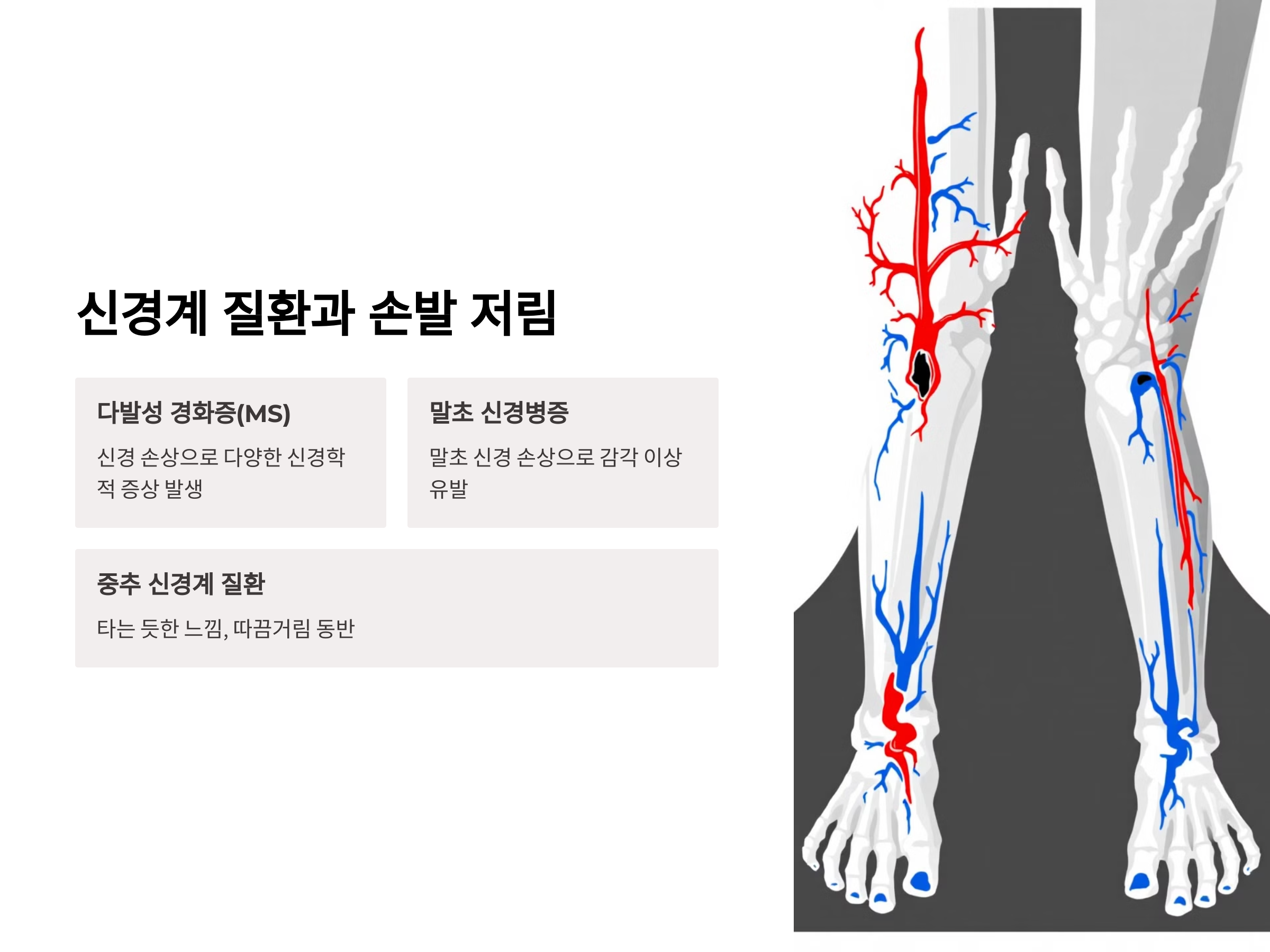 신경계 질환은 손발 저림의 주요 원인 중 하나입니다. '다발성 경화증(MS)', '말초 신경병증', '중추 신경계 질환' 등 다양한 신경계 질환이 손발 저림을 일으킬 수 있습니다. 특히 다발성 경화증은 신경의 손상으로 인해 다양한 신경학적 증상이 나타나며, 손발 저림, 근육 약화, 시각 장애 등이 동반될 수 있습니다.