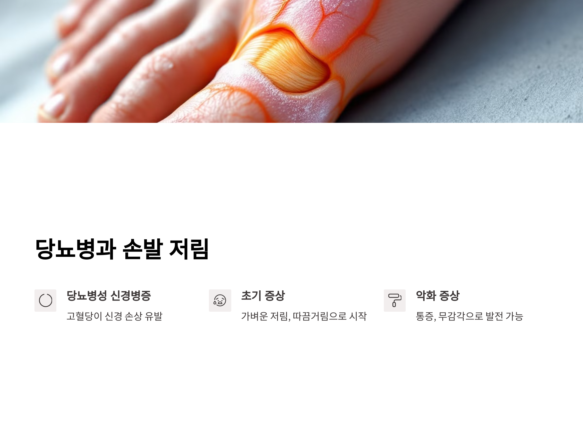 당뇨병성 신경병증은 초기에는 가벼운 저림이나 따끔거림으로 나타나며, 시간이 지날수록 증상이 악화되어 통증이나 무감각 증상으로 발전할 수 있습니다. 당뇨병을 관리하지 않으면 손발 저림 증상 외에도 다양한 합병증이 발생할 수 있기 때문에 꾸준한 혈당 관리가 필수적입니다.
