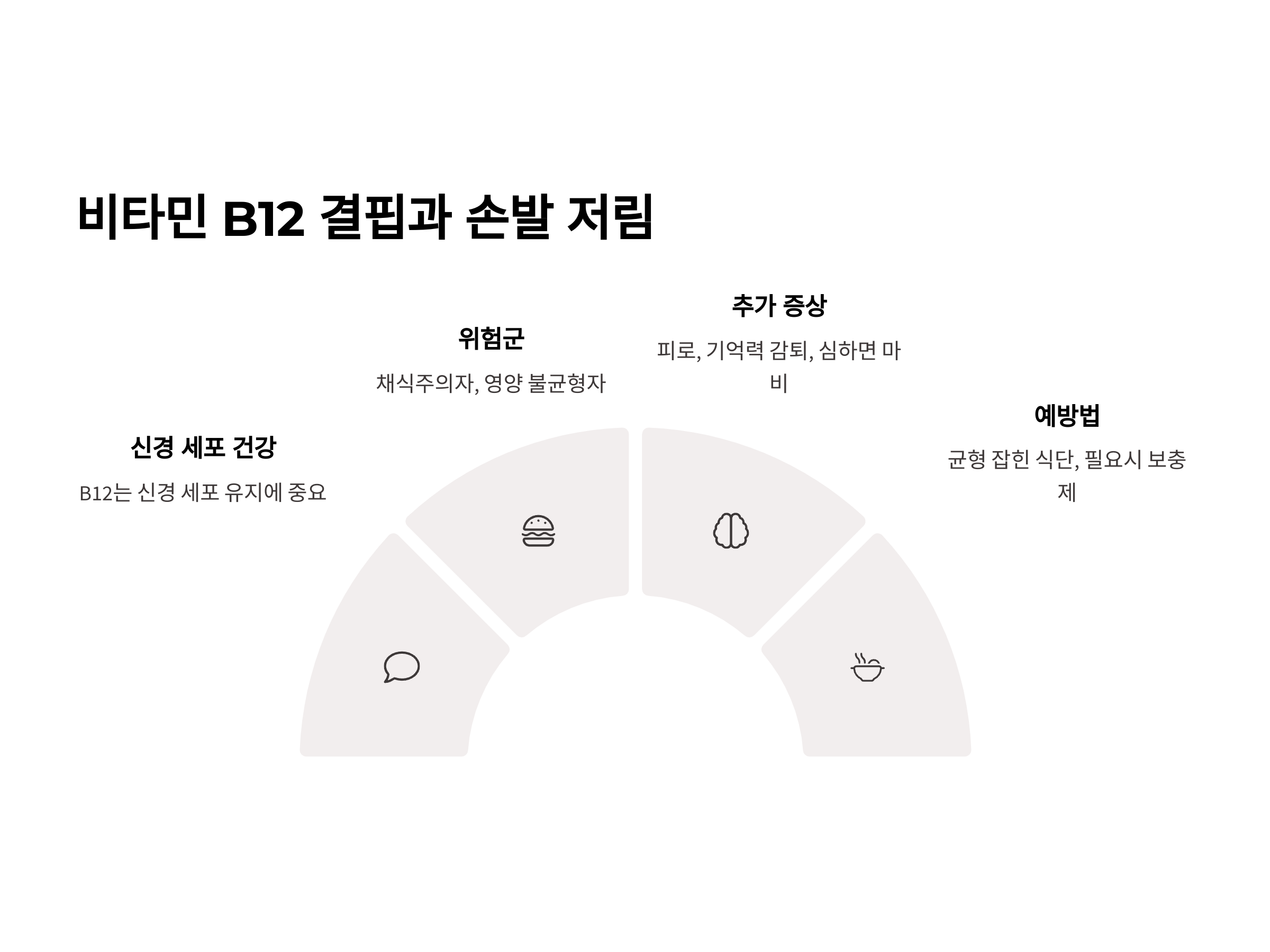 B12 결핍이 심각해지면 손발 저림 외에도 피로, 기억력 감퇴, 심한 경우 신경 손상으로 인해 마비가 발생할 수 있습니다. 따라서 B12 결핍을 예방하기 위해서는 균형 잡힌 식단을 유지하고, 필요시 비타민 보충제를 섭취하는 것이 좋습니다.