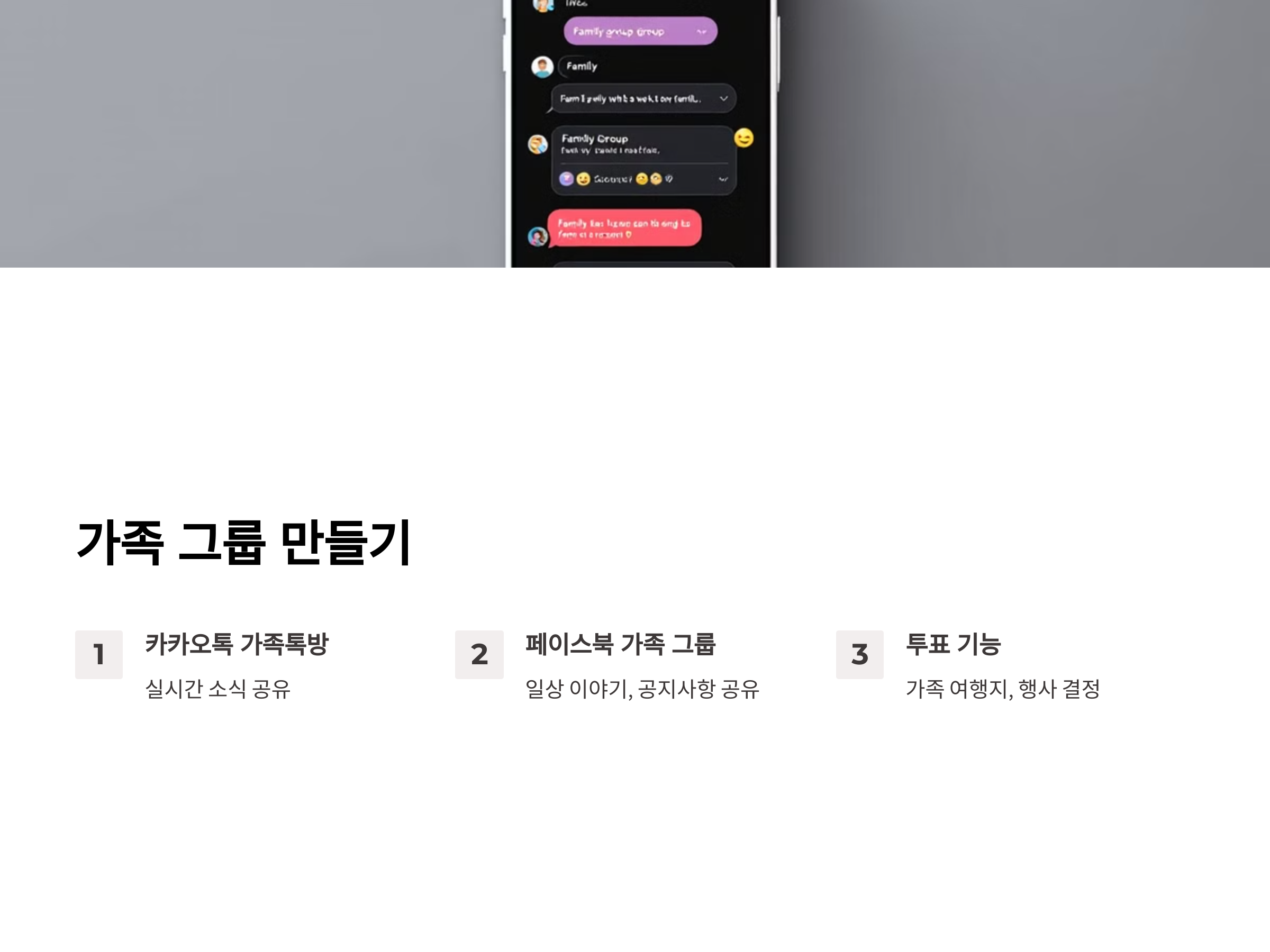 가족 그룹을 만든 뒤, 일상적인 이야기나 중요한 공지사항, 사진 공유 등을 통해 소통할 수 있습니다. 예를 들어, 자녀가 학교에서 있었던 일이나 부모님께서 주말에 계획한 일정을 쉽게 공유할 수 있습니다. 또한, 그룹 내에서 투표 기능을 활용해 가족 여행지나 행사에 대한 결정을 간편하게 할 수 있어 편리합니다.