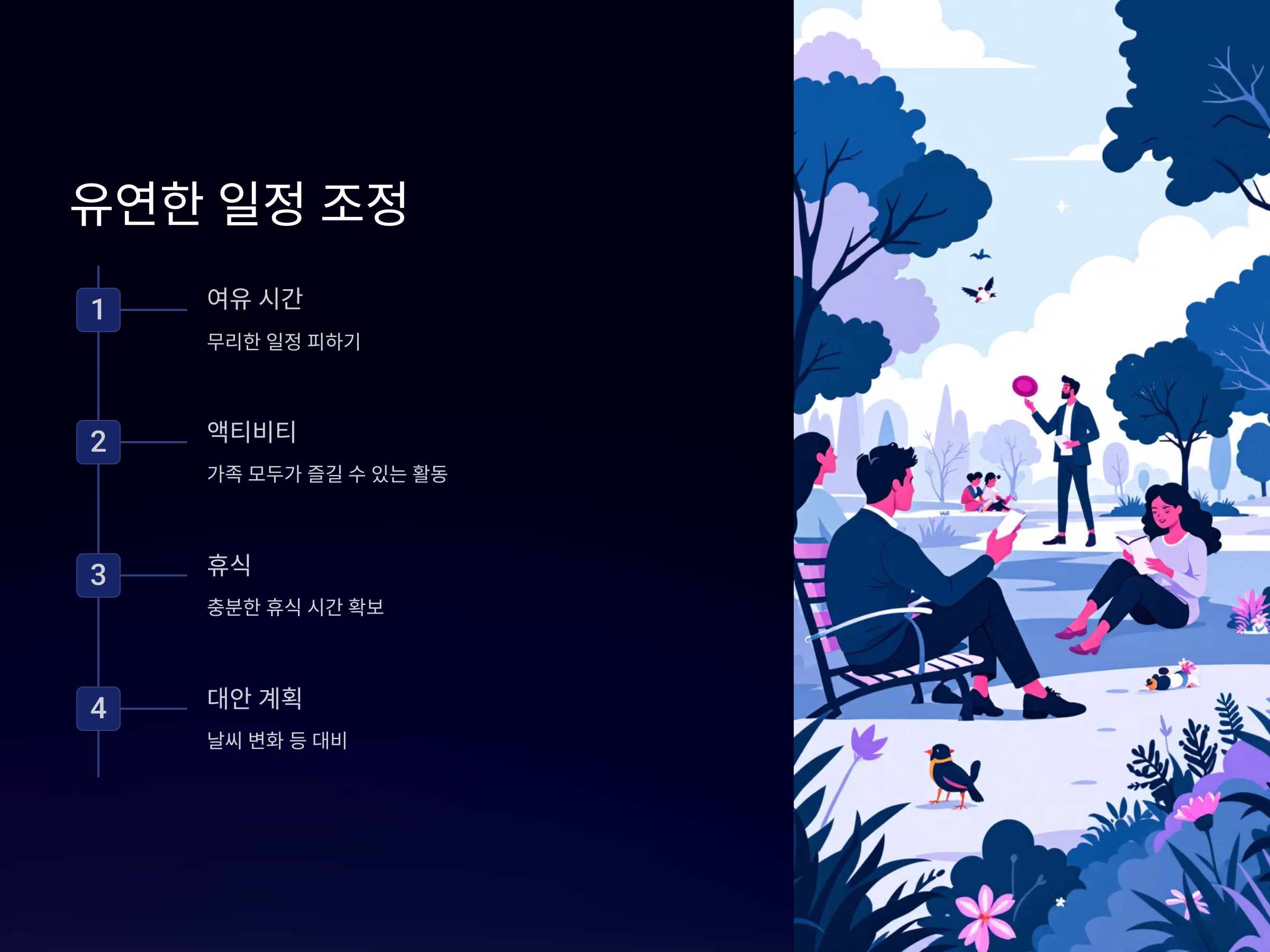 가족 여행을 계획할 때 중요한 점은 일정에 너무 딱 맞춰서 계획하지 않는 것입니다. 일정을 세분화하고, 여유 시간도 두어야 합니다. 아이들이 있을 경우 계획에 여유를 두고, 예상치 못한 상황에 대비할 수 있도록 유연한 일정을 짜는 것이 중요합니다.
