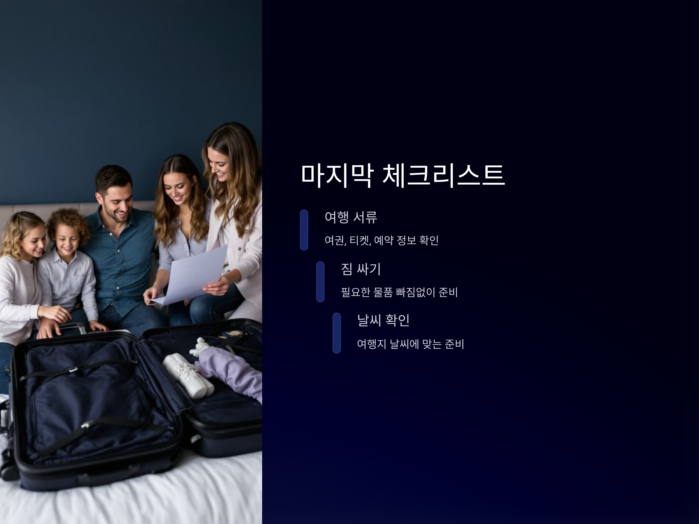 여행을 떠나기 전에는 준비물을 빠짐없이 체크리스트로 정리하는 것이 중요합니다. 무엇을 챙겨야 할지 모르면 걱정되기도 하지만, 체크리스트가 있으면 준비가 훨씬 수월해집니다. 특히 아이들과 함께하는 여행은 각종 준비물이 더 많기 때문에, 꼼꼼하게 준비물을 체크하는 것이 중요합니다.