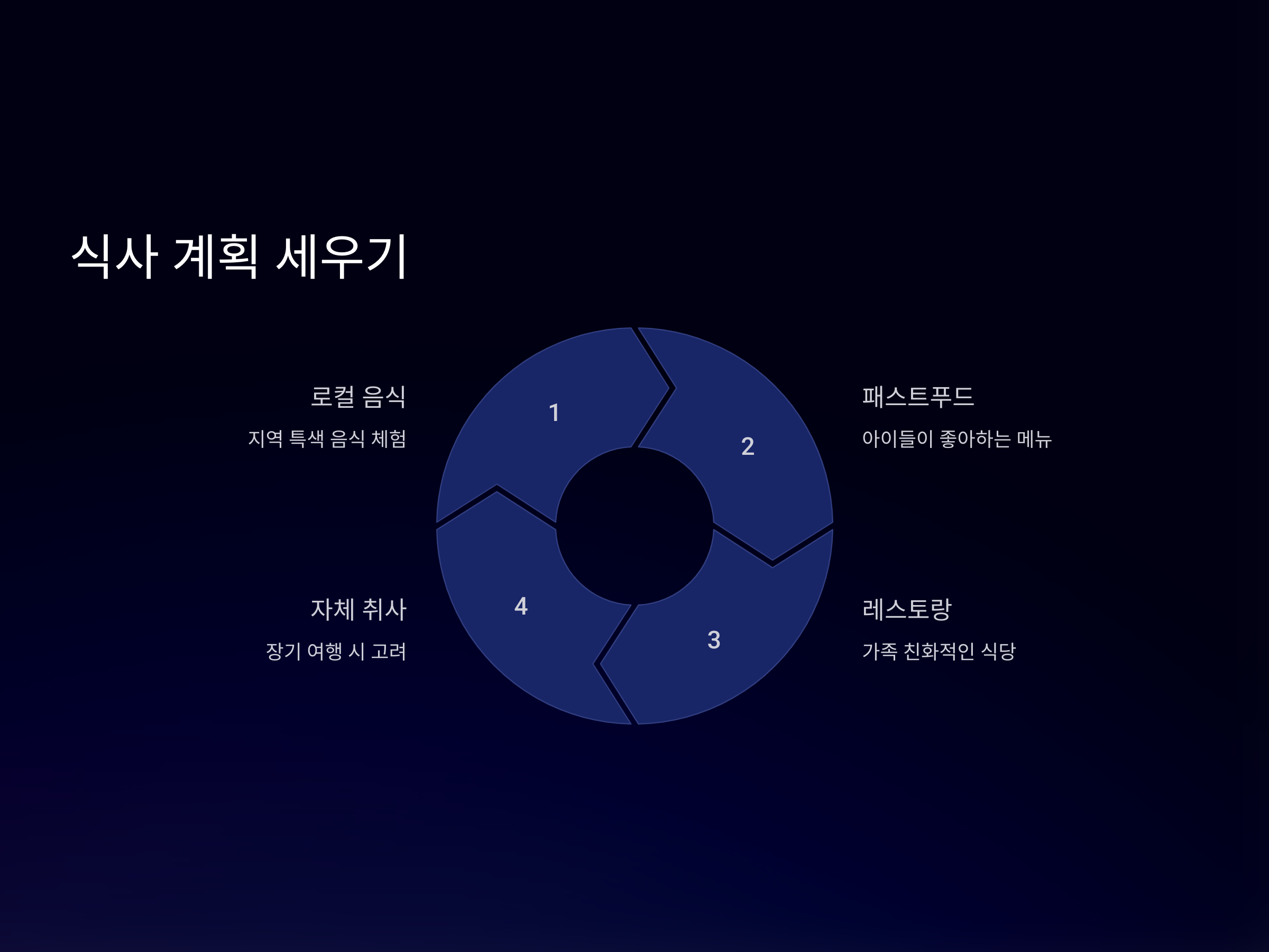 가족 여행에서는 먹는 것도 큰 부분을 차지합니다. 여행지에서 어떤 음식을 먹을지 미리 생각하고 계획을 세우는 것이 좋습니다. 특히 어린 자녀가 있는 가정이라면 아이들이 먹을 수 있는 음식을 준비하는 것이 중요합니다.