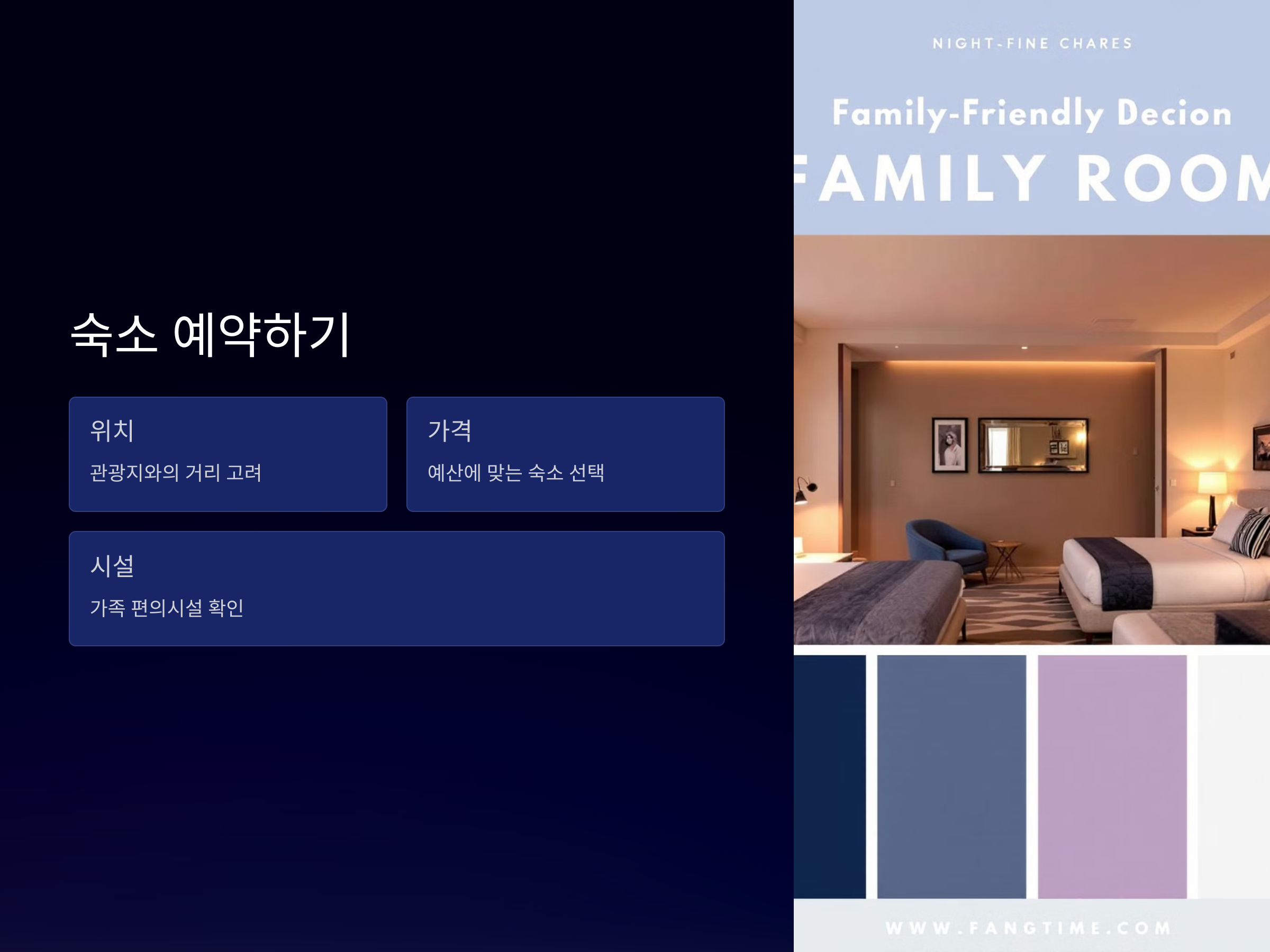 숙소는 가족이 모두 편하게 지낼 수 있는 곳을 선택해야 합니다. 위치, 가격, 시설 등을 고려하여 예약할 곳을 정하세요. Airbnb나 호텔 예약 사이트를 통해 미리 예약하고, 가족이 머물기에 적합한 숙소를 선택하는 것이 중요합니다.