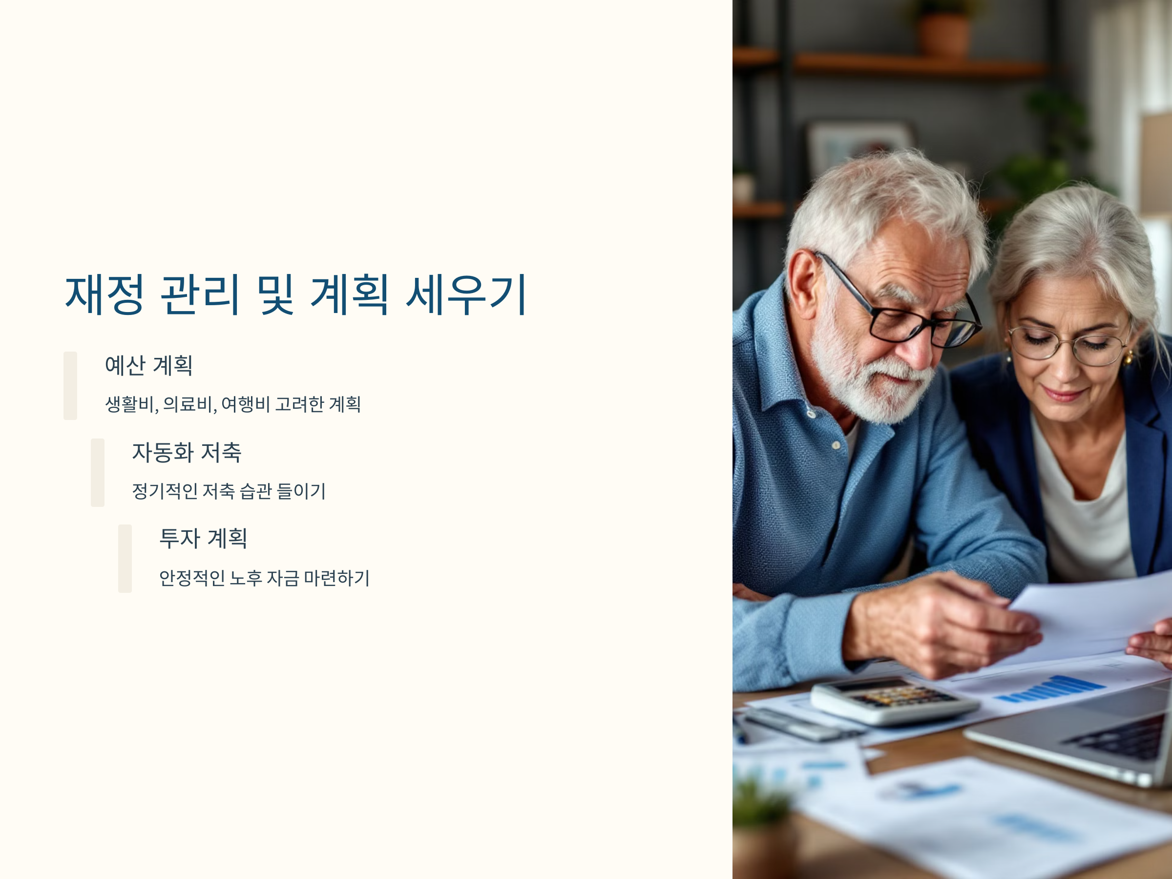 부부는 함께 재정 계획을 세울 때, 생활비와 의료비, 여행비 등 다양한 항목을 고려해야 합니다. 또한, 자동화된 저축이나 투자 계획을 통해 재정적으로 안정된 기반을 마련하는 것이 중요합니다. 은퇴 후에도 경제적인 걱정 없이 활동할 수 있도록 부부가 함께 계획을 세우고 실천해 나가는 것이 필요합니다.