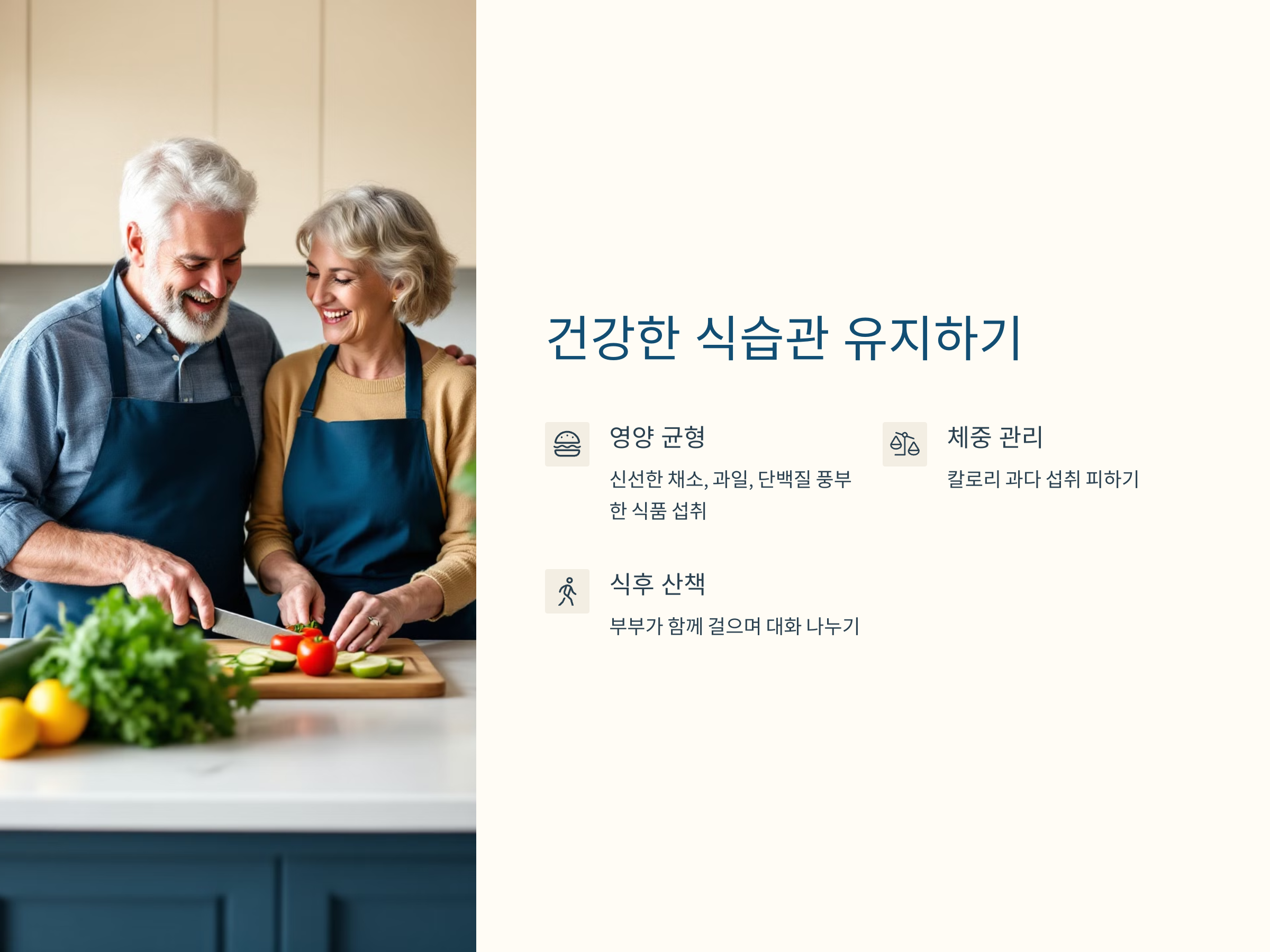 부부는 식사에서 영양 균형을 맞추는 것이 중요합니다. 신선한 채소와 과일, 단백질이 풍부한 식품, 그리고 필수 영양소를 충분히 섭취할 수 있는 식단을 계획해야 합니다. 한편, 칼로리 과다 섭취를 피하고 체중을 관리하는 것도 중요합니다. 건강한 몸이야말로 즐거운 노후를 만드는 밑거름이 됩니다.