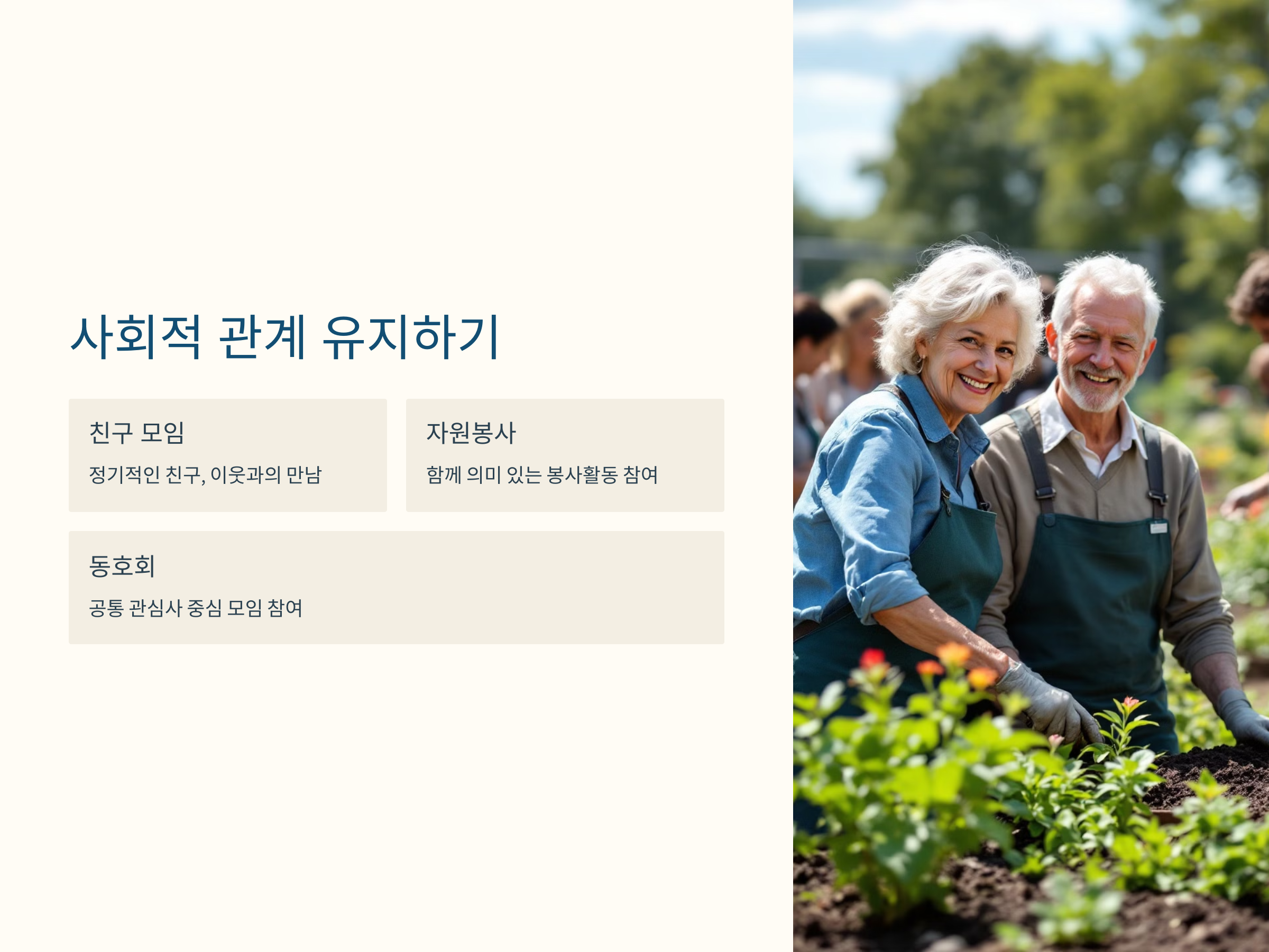 노후를 즐기려면 사회적 관계를 유지하는 것이 중요합니다. 은퇴 후, 사람들과의 교류가 줄어들 수 있기 때문에 외로움을 느낄 수 있습니다. 하지만 부부가 함께 새로운 사람들과 만나는 활동을 한다면 이 문제를 극복할 수 있습니다.