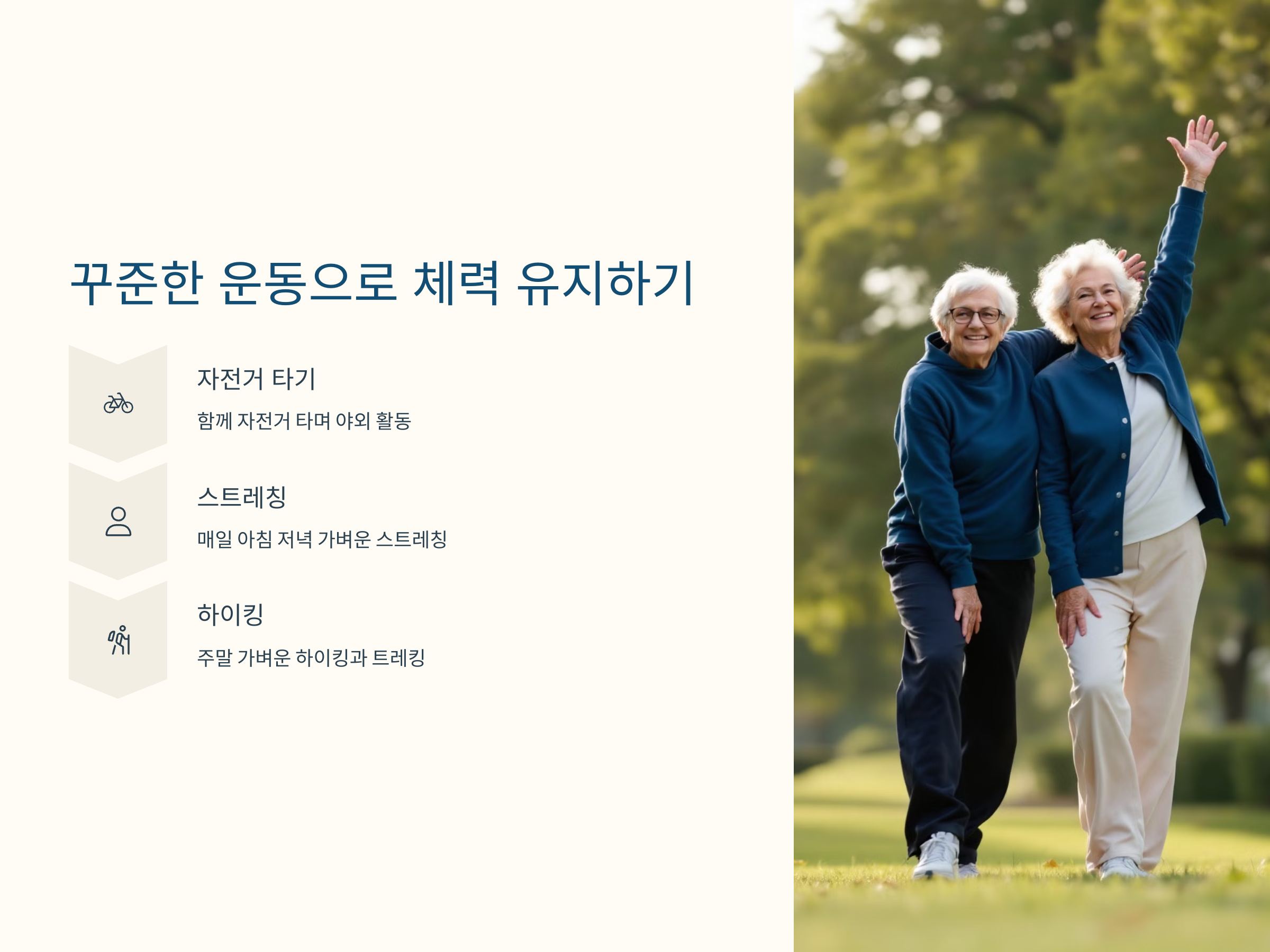 운동은 노후에 가장 중요한 활동 중 하나입니다. 부부가 함께 운동하는 것은 신체적 건강뿐만 아니라 정서적 안정에도 매우 효과적입니다. 운동을 습관화하면 노후에 찾아오는 여러 가지 질병을 예방하고, 체력도 유지할 수 있습니다.