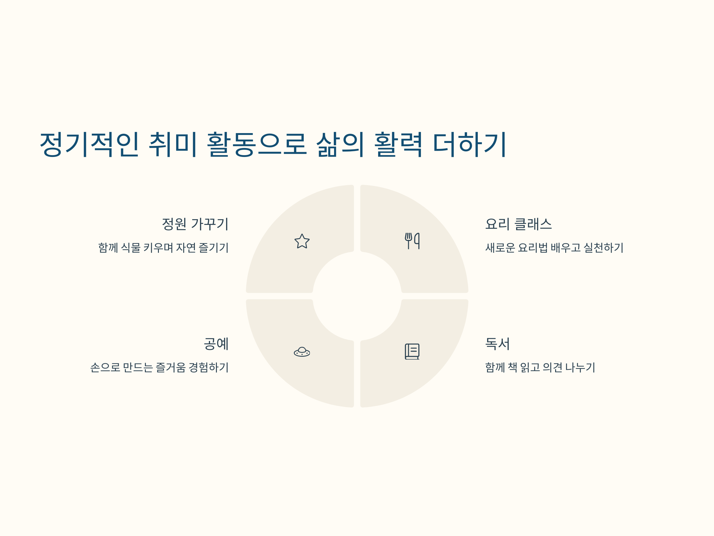 부부는 각자의 취미를 갖기도 하지만, 공유할 수 있는 공통의 취미를 찾는 것도 큰 장점입니다. 이런 활동들은 두 사람의 대화를 더욱 풍성하게 하고, 서로에게 긍정적인 영향을 미칩니다.