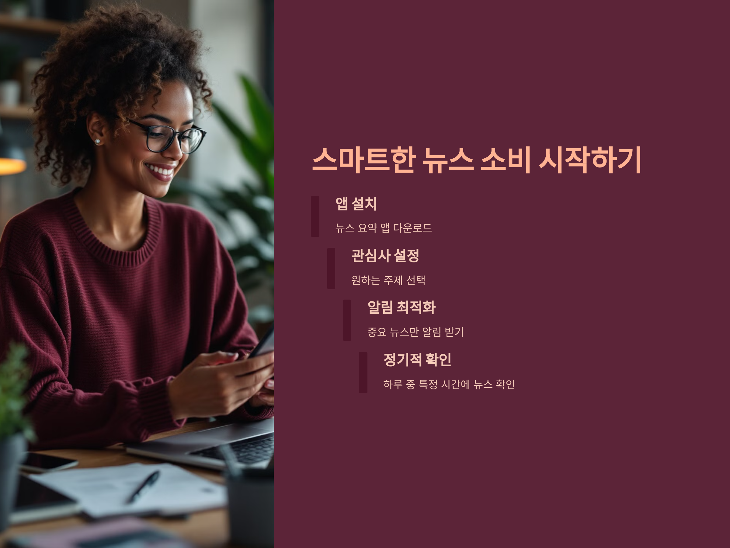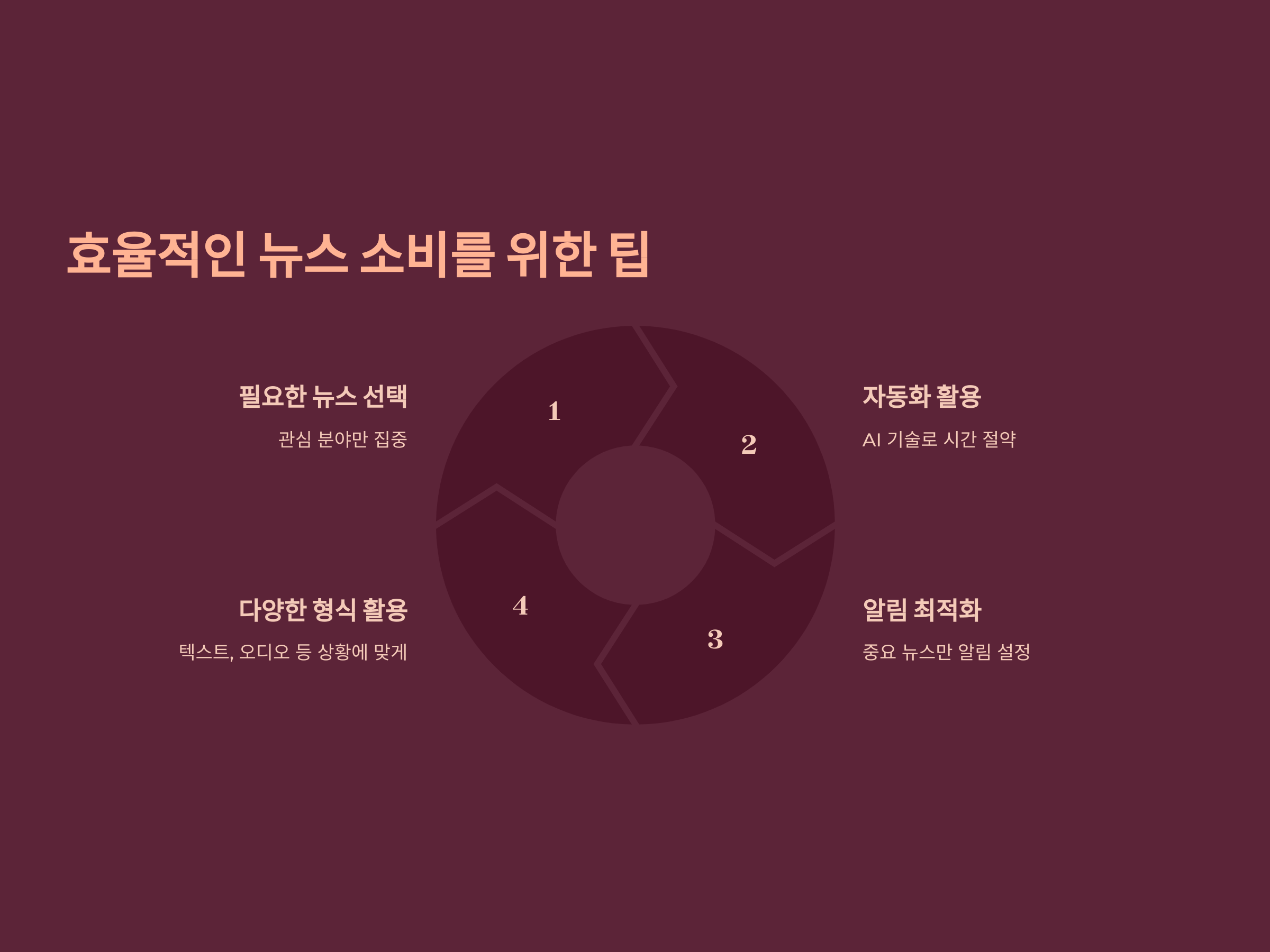 뉴스를 효율적으로 소비하는 방법에는 여러 가지가 있지만, 가장 중요한 점은 시간을 절약하면서도 중요한 정보를 놓치지 않는 것입니다. AI 기술을 활용한 뉴스 요약 도구, 스마트폰 알림 기능, 뉴스 큐레이션 앱 등 다양한 방법을 통해 뉴스 소비 시간을 단축시킬 수 있습니다.