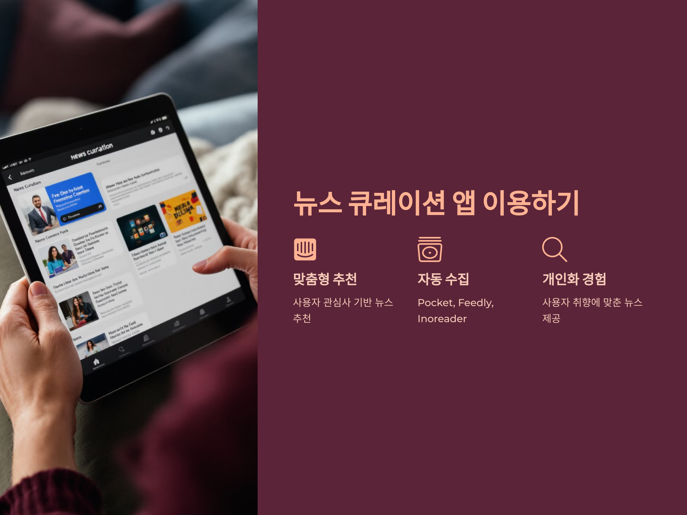 특히 뉴스 큐레이션 앱을 활용하면, 사용자가 구독한 뉴스 웹사이트나 블로그의 업데이트를 쉽게 따라갈 수 있어 정보를 놓치지 않게 됩니다. 또한 각 기사는 사용자의 취향에 맞춰 보여지므로 더욱 개인화된 뉴스 소비가 가능합니다.