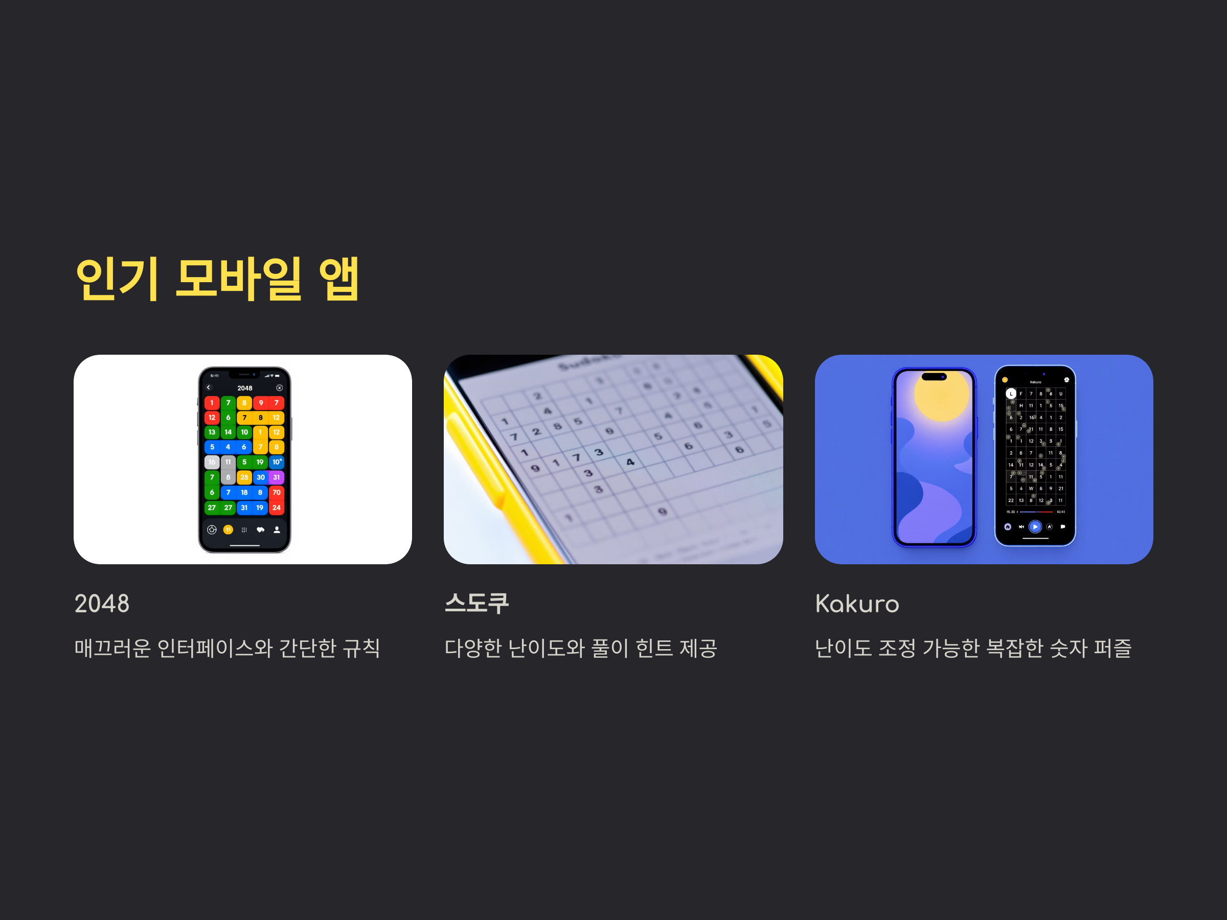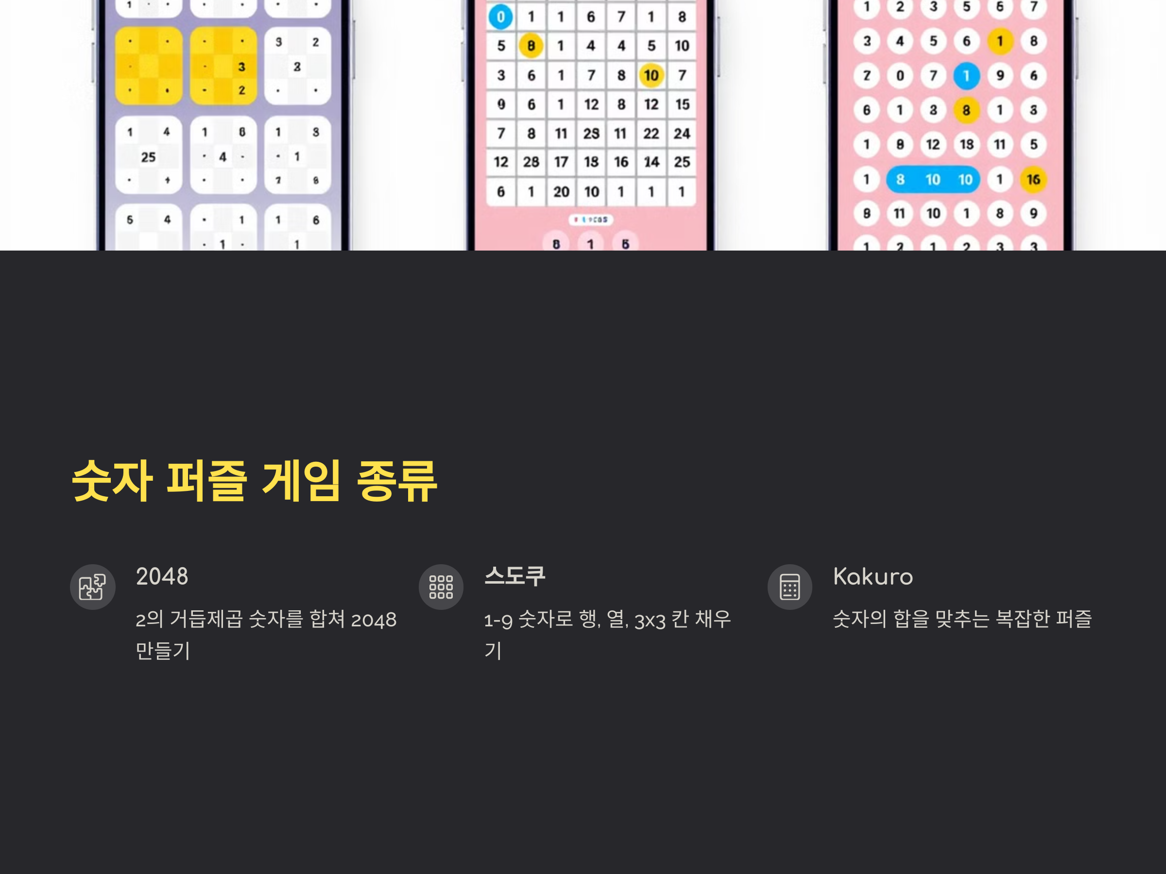 - 다양한 유형의 퍼즐 도전: 2048, 스도쿠, Kakuro 외에도 다양한 퍼즐들이 있습니다. 각 게임이 제공하는 방식이 다르기 때문에, 여러 유형의 게임을 시도하며 퍼즐 해결 능력을 키울 수 있습니다.
