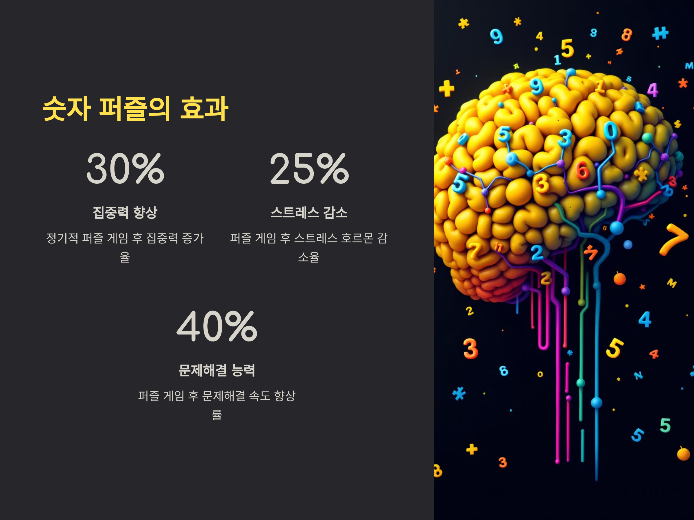 - 뇌의 건강 증진: 숫자 퍼즐은 뇌를 자극하고, 문제 해결 능력을 향상시킵니다. 이를 통해 치매 예방에도 도움을 줄 수 있습니다.