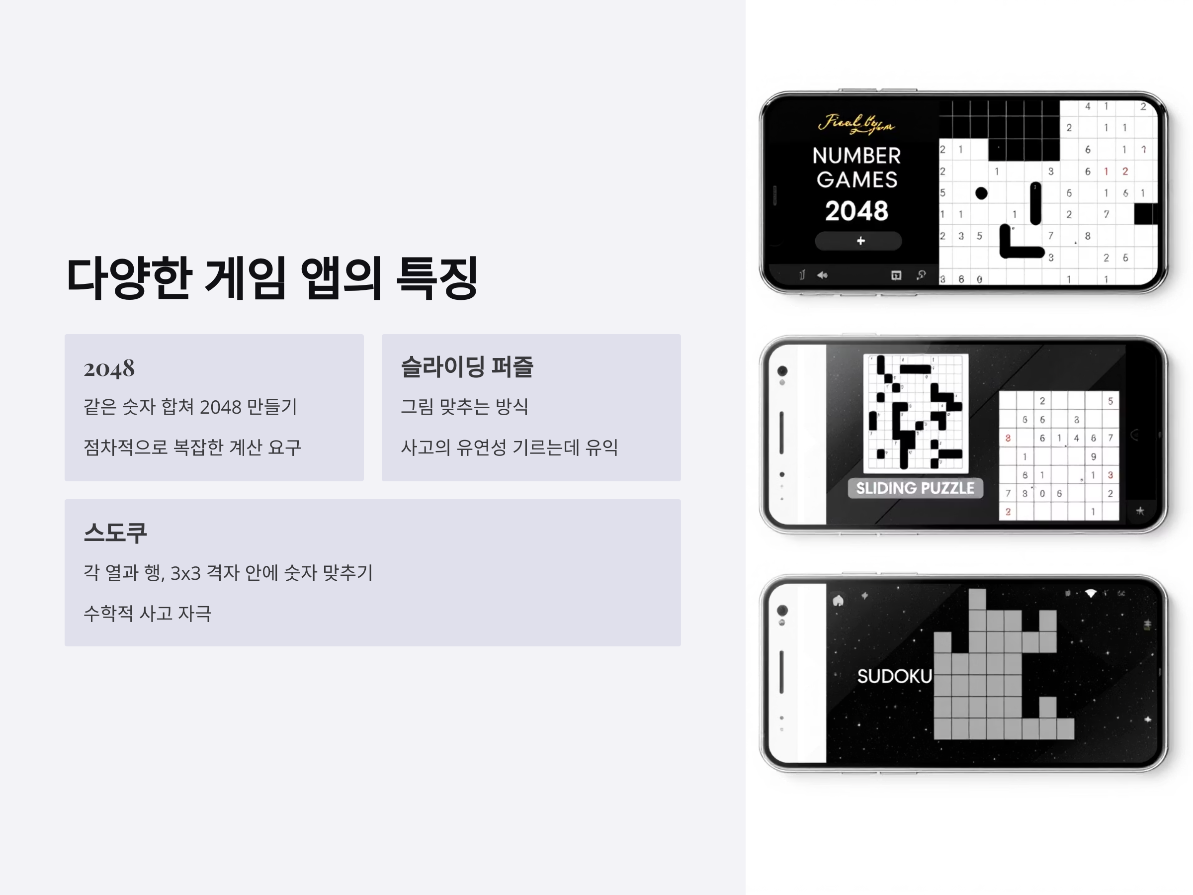 반면에 '슬라이딩 퍼즐'은 그림을 맞추는 방식으로, 미로 같은 형태의 숫자 배열을 해결해야 합니다. 이 게임은 시각적인 재미를 주며, 사고의 유연성을 기르는 데 유익합니다. 또 다른 예로 '스도쿠'가 있는데, 스도쿠는 숫자의 규칙을 맞추는 고전적인 퍼즐입니다. 각 열과 행, 3x3 격자 안에 숫자를 맞추는 방식으로, 수학적 사고를 자극하며 문제 해결 능력을 키우는 데 도움이 됩니다.