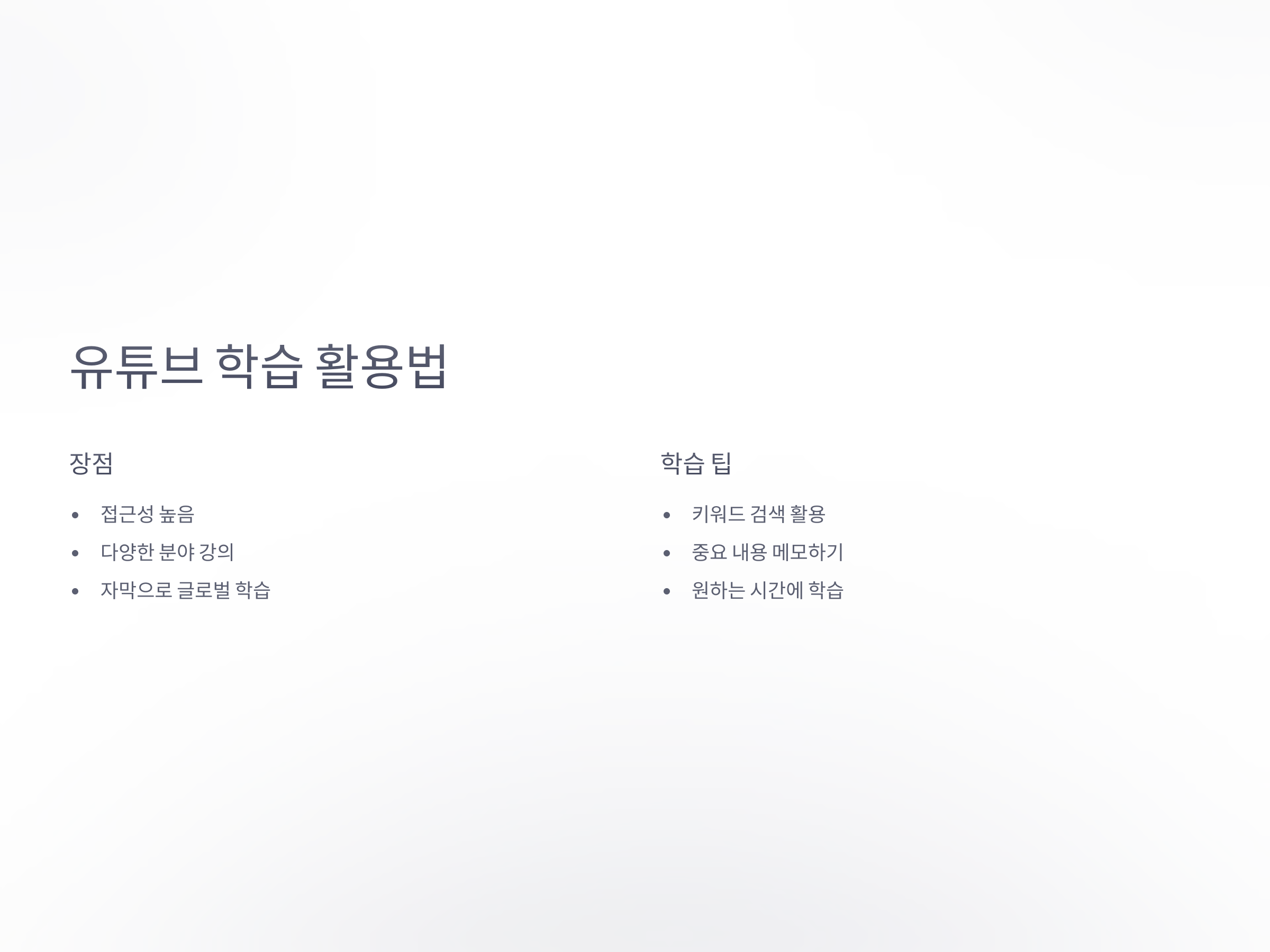 유튜브에서의 학습의 장점은 시청자가 원하는 시간에 강의를 들을 수 있다는 점입니다. 또한, 다양한 언어로 자막을 제공하기 때문에 글로벌 학습도 가능합니다. 예를 들어, 인공지능, 데이터 분석, 소프트웨어 개발, 언어 학습 등 여러 분야에서 유용한 자료들을 찾을 수 있습니다.