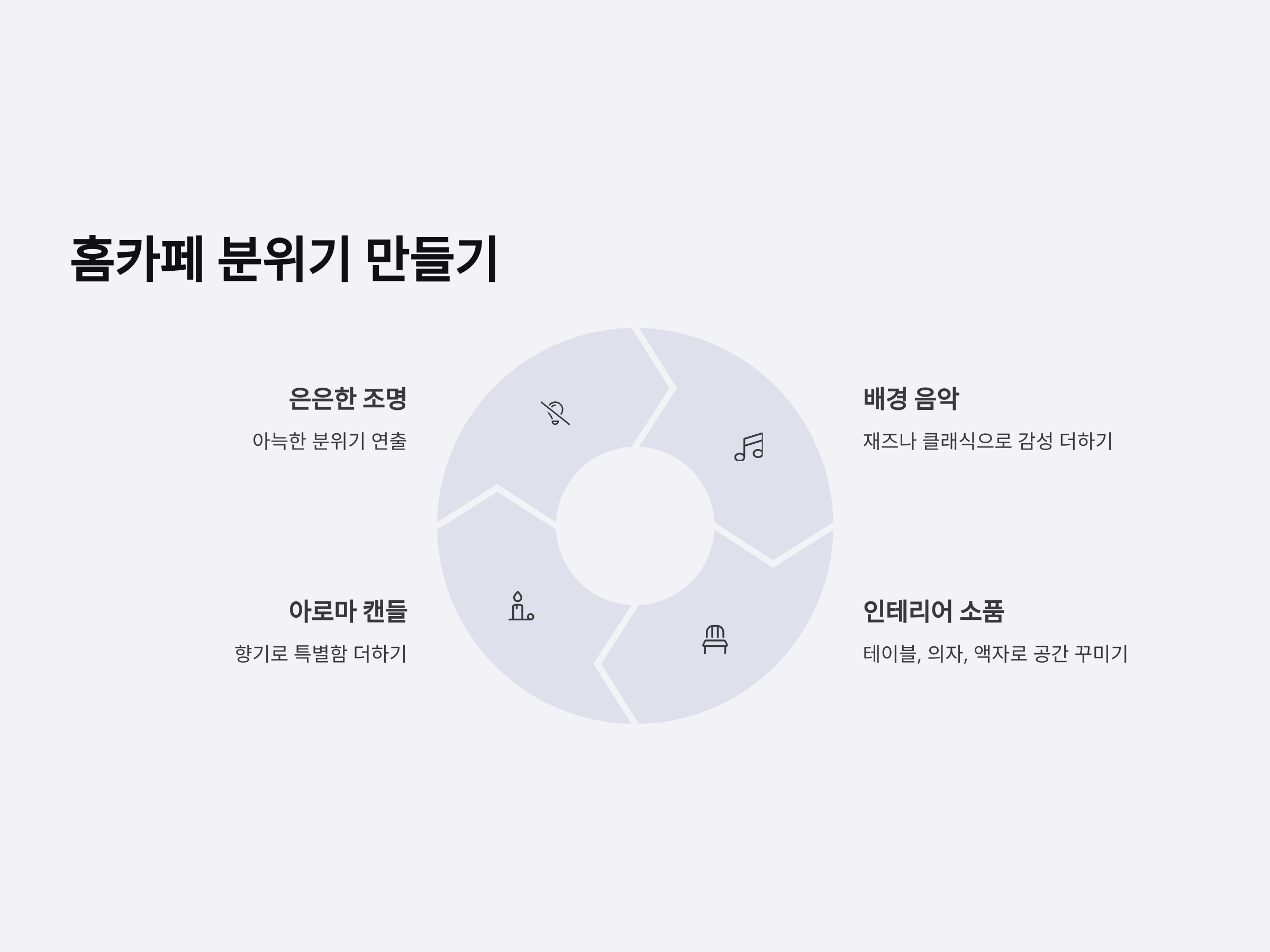 홈카페의 매력 중 하나는 바로 그 분위기입니다. 카페에 가면 즐길 수 있는 다양한 인테리어와 분위기를 집에서도 재현할 수 있습니다. 배우자와 함께 인테리어 소품을 고르고, 자신만의 스타일로 홈카페 공간을 꾸며보세요. 예를 들어, 작은 테이블과 아늑한 의자를 배치하거나, 벽에 예쁜 액자나 캔들을 놓는 것만으로도 카페 분위기를 낼 수 있습니다.