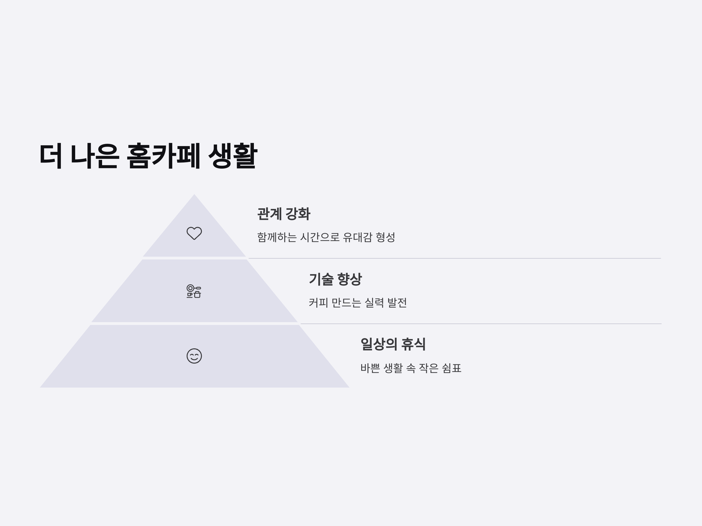홈카페는 단순한 음료를 만드는 것을 넘어, 배우자와 함께 시간을 보내고, 서로의 취향을 존중하며 즐거운 분위기를 만들어가는 경험입니다. 다양한 커피 도구와 재료들을 활용해 나만의 커피를 만들고, 아늑한 분위기에서 커피를 즐기는 시간은 일상에 특별한 가치를 더해줍니다.