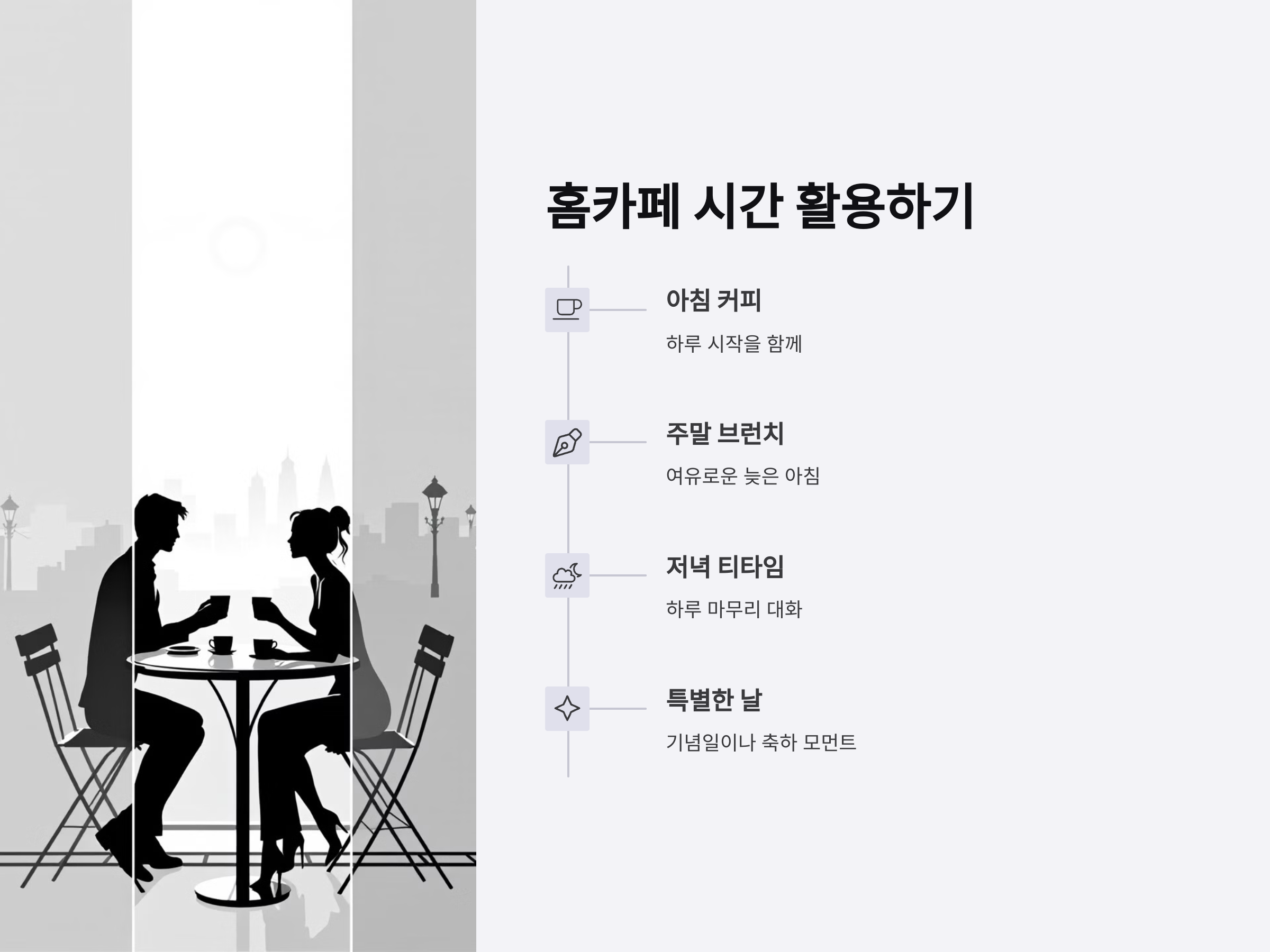 홈카페에서 가장 중요한 것은 바로 함께하는 즐거운 시간입니다. 커피를 내리고, 서로의 취향을 공유하며 이야기하는 시간은 그 자체로 큰 행복을 줍니다. 매일 반복되는 일상 속에서 배우자와의 대화는 매우 중요한데, 홈카페에서 시간을 보내면서 서로의 생각을 나누는 기회가 될 수 있습니다.