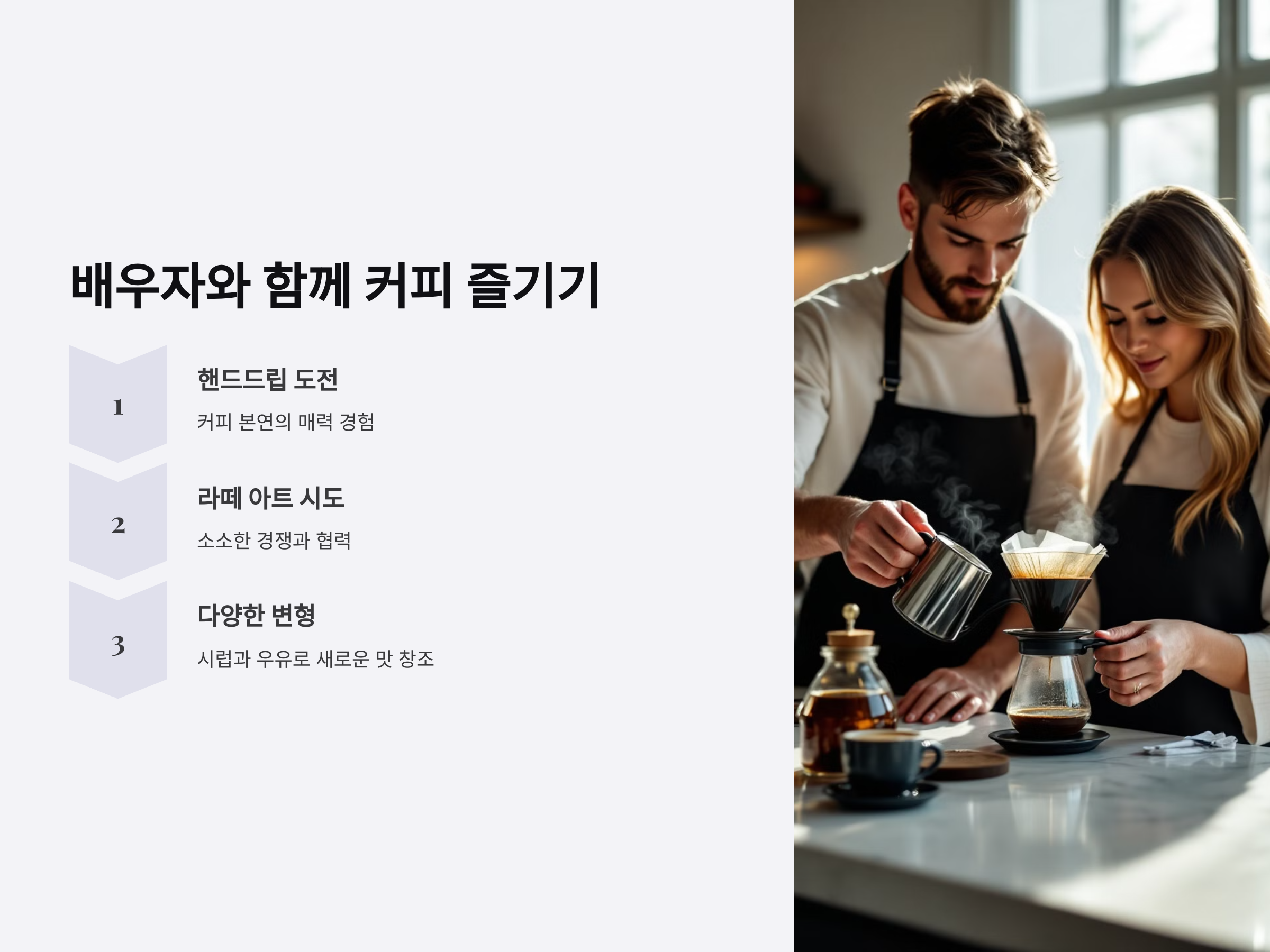핸드드립 외에도, 에스프레소 머신을 활용해 카페에서만 볼 수 있던 라떼 아트도 도전할 수 있습니다. 배우자와 함께 라떼 아트를 하며 커피를 내릴 때, 그 과정에서 소소한 경쟁이나 협력이 더해져 즐거운 시간이 될 것입니다. 또한, 다양한 커피 시럽이나 우유를 활용한 다양한 커피 변형을 시도해보는 것도 좋습니다. 예를 들어, 카페 모카나 카라멜 마키아토처럼 달콤한 음료를 만들어 보세요.