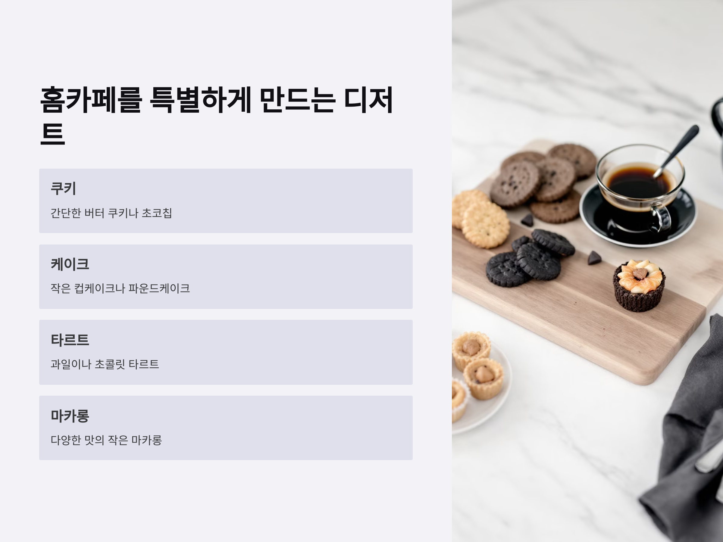 커피와 함께라면, 디저트가 빠질 수 없습니다. 홈카페를 더욱 특별하게 만드는 방법은 바로 디저트를 함께 준비하는 것입니다. 배우자와 함께 간단한 디저트를 만들면서, 커피와 함께 즐길 수 있는 시간을 가져보세요. 예를 들어, 쿠키, 케이크, 타르트 등은 커피와 잘 어울리는 디저트입니다.