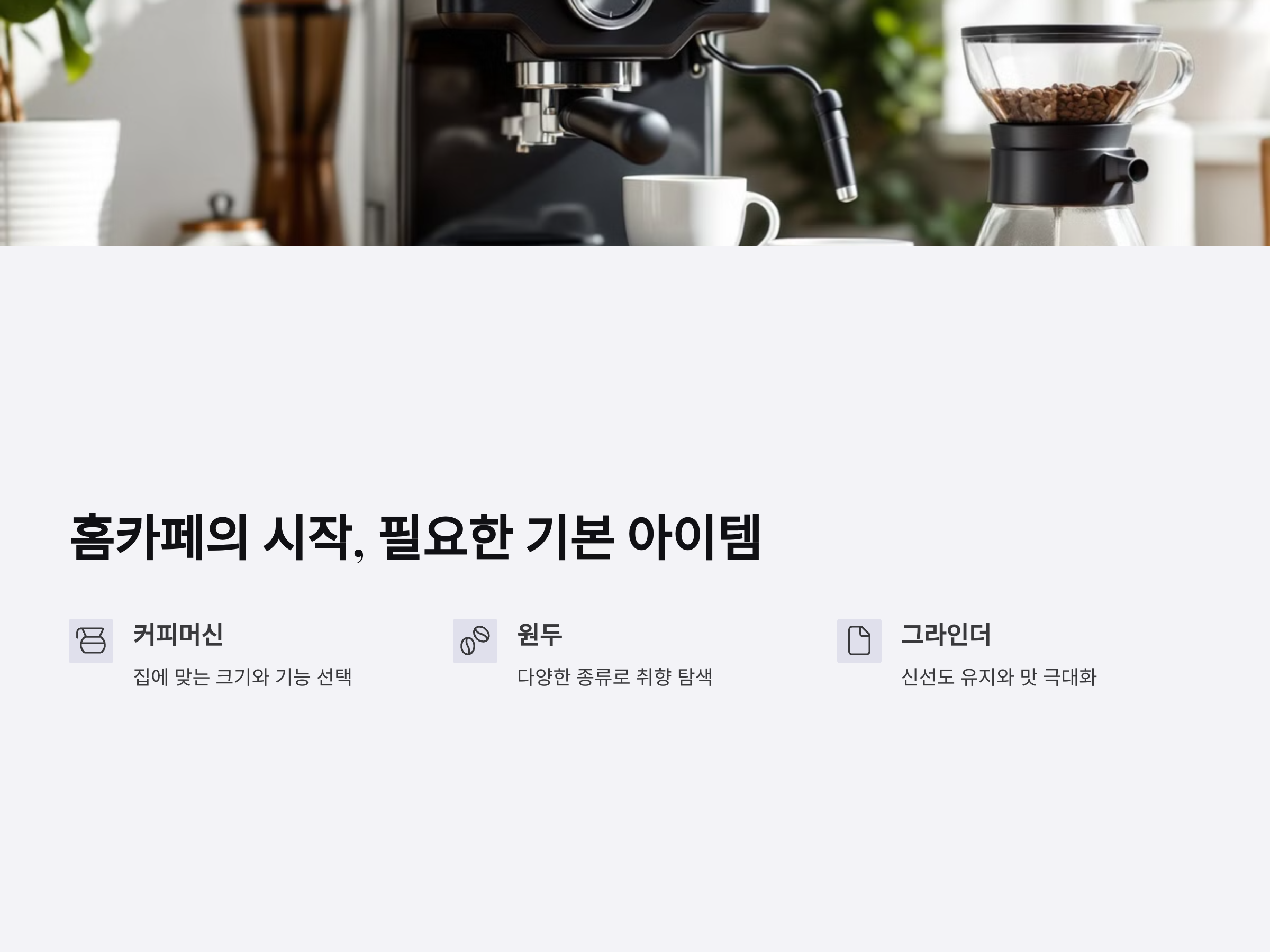 홈카페는 이제 단순한 유행을 넘어서, 많은 사람들이 집에서 커피와 음료를 즐기기 위한 공간으로 자리잡았습니다. 특히 배우자와 함께라면, 더욱 특별한 시간을 만들 수 있는 기회입니다. 서로의 취향에 맞는 커피나 음료를 만들며, 바쁜 일상 속에서 소소한 힐링을 즐길 수 있는 홈카페. 지금부터 가정 내에서 손쉽게 홈카페를 만들 수 있는 방법을 소개하겠습니다.