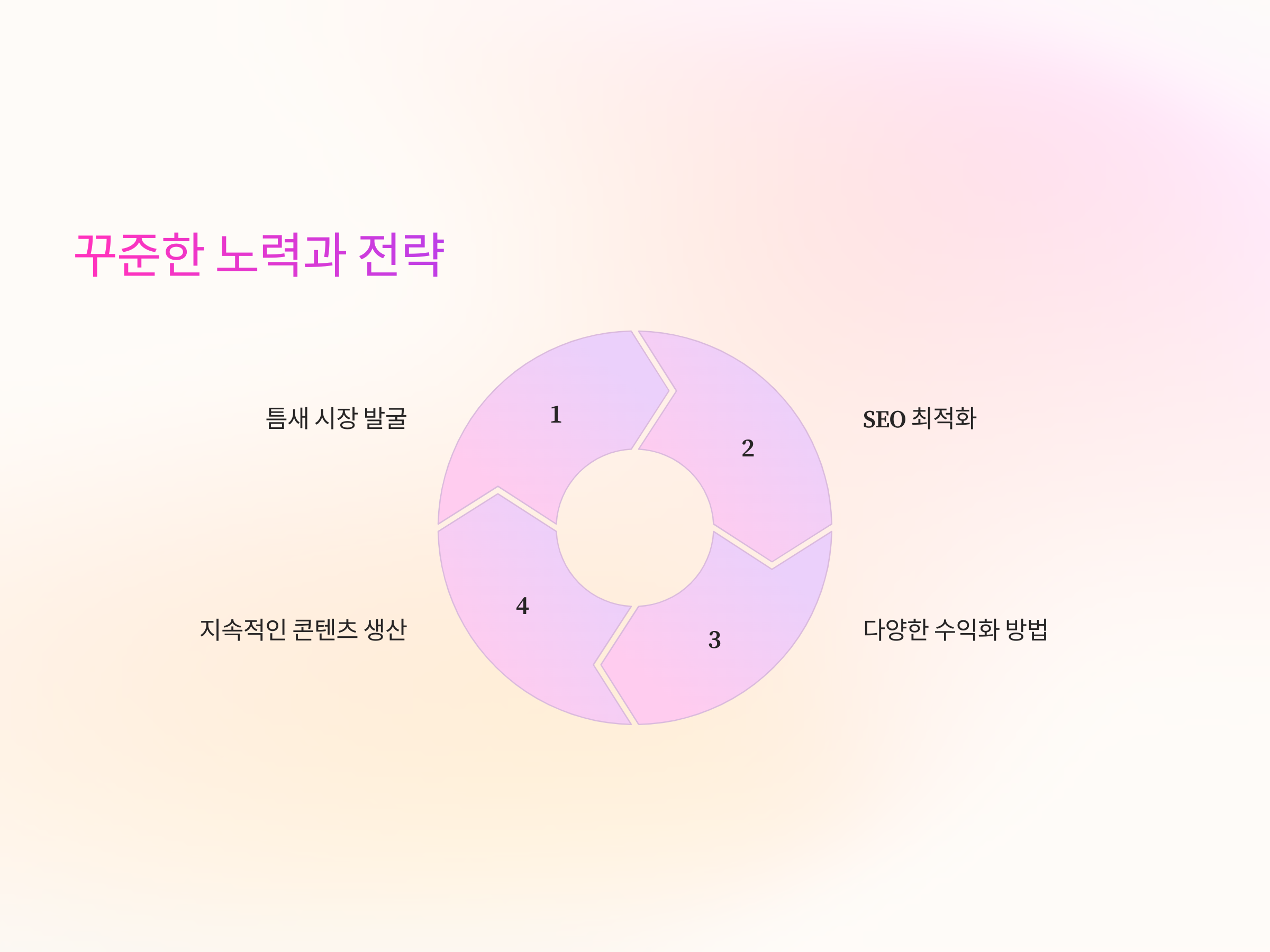 블로그를 통해 수익을 창출하는 것은 한 번에 이루어지는 일이 아닙니다. 수익화까지 가는 길은 시간과 꾸준한 노력이 필요합니다. 하지만, 자신만의 틈새 시장을 찾고, SEO를 최적화하며, 다양한 수익화 방법을 활용한다면, 점차적으로 안정적인 수익을 얻을 수 있습니다.