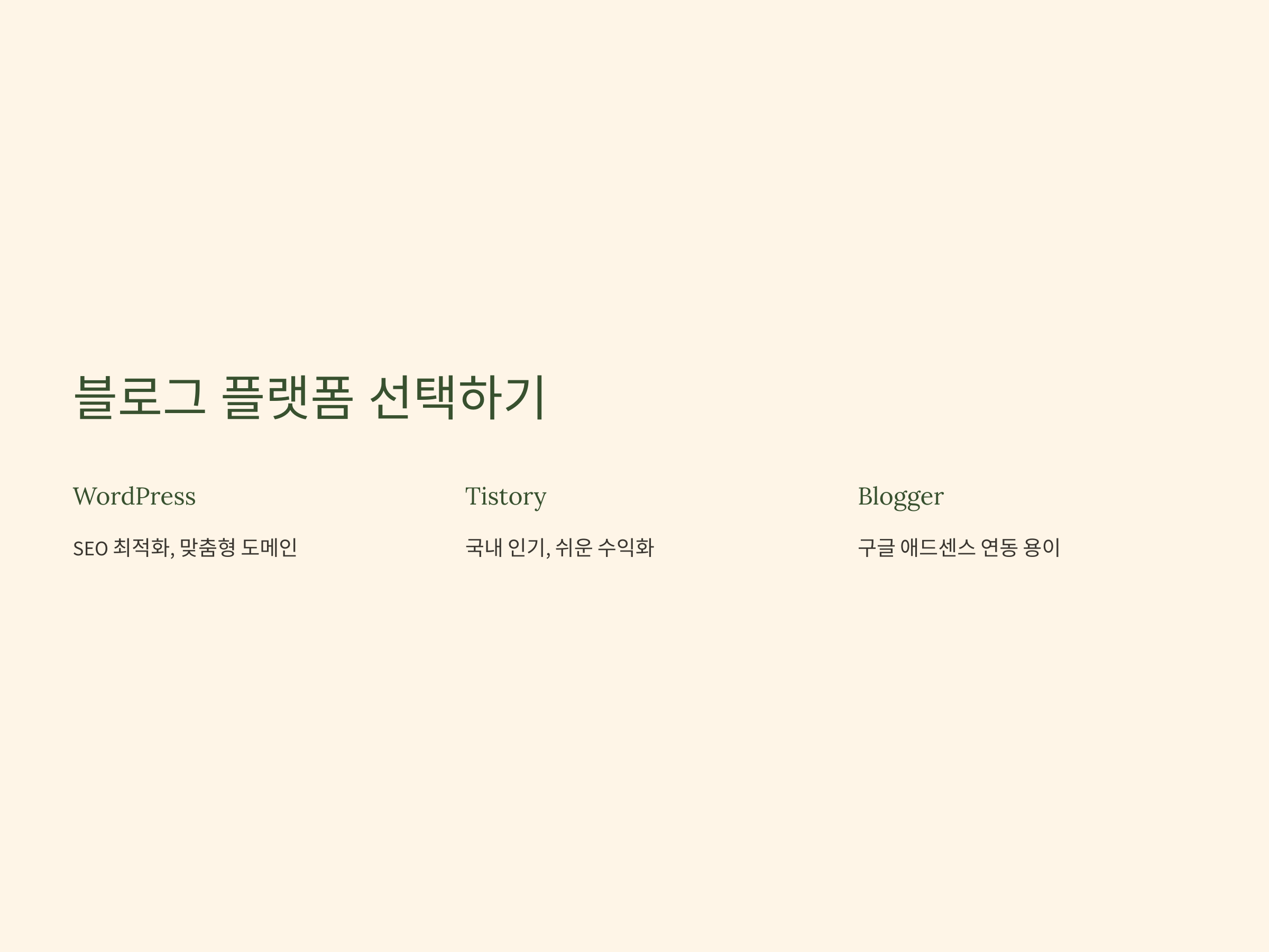 Tistory는 국내에서 많은 사람들이 사용하는 블로그 플랫폼입니다. 구글 애드센스를 지원하며, 수익화가 비교적 쉬운 플랫폼입니다. 블로그 운영이 처음이라면 Tistory를 사용하는 것도 좋은 선택입니다. 하지만 디자인 자유도가 낮고, 광고 수익화가 조금 느릴 수 있는 점은 단점입니다.