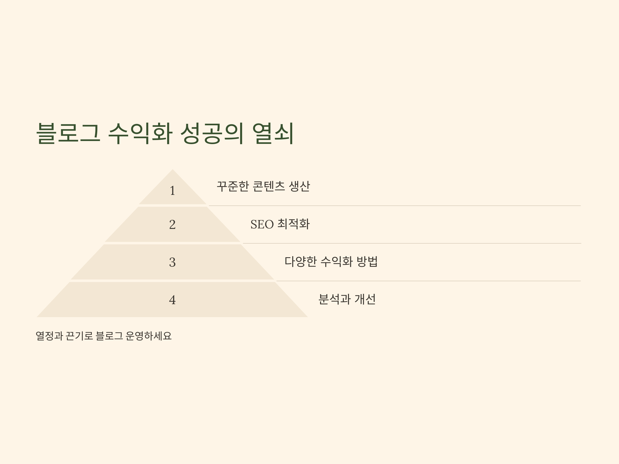 블로그 수익화는 단기적인 목표가 아니라, 지속적인 노력이 필요합니다. 처음에는 작은 수익이라도 시간이 지나면 점점 더 많은 수익을 올릴 수 있습니다. 본인의 열정과 끈기를 믿고 꾸준히 블로그를 운영해 보세요.