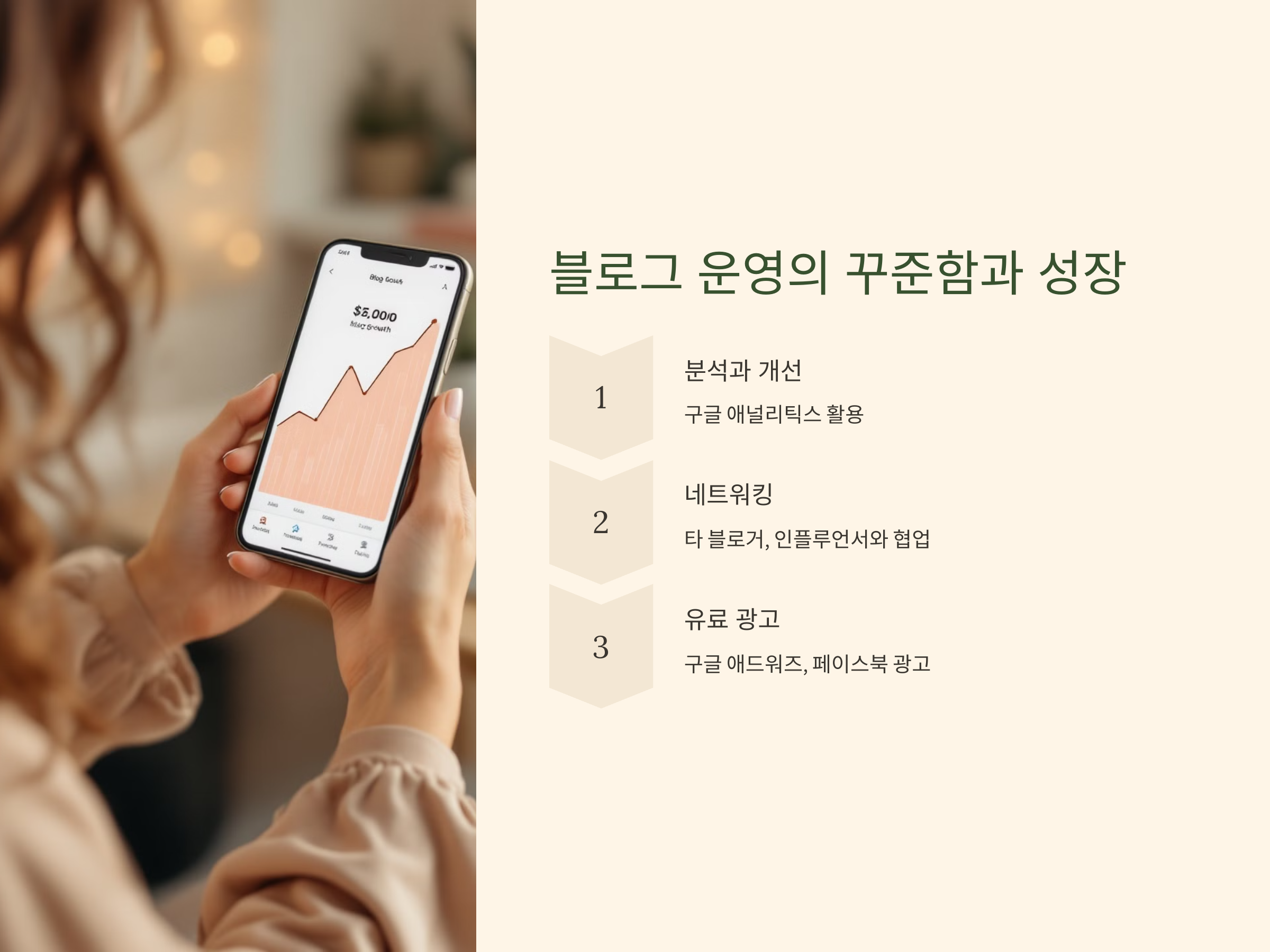 - 분석과 개선: 구글 애널리틱스와 같은 도구를 활용해 방문자 수와 페이지뷰를 분석하고, 어떤 콘텐츠가 잘 작동하는지 파악하여 개선합니다.