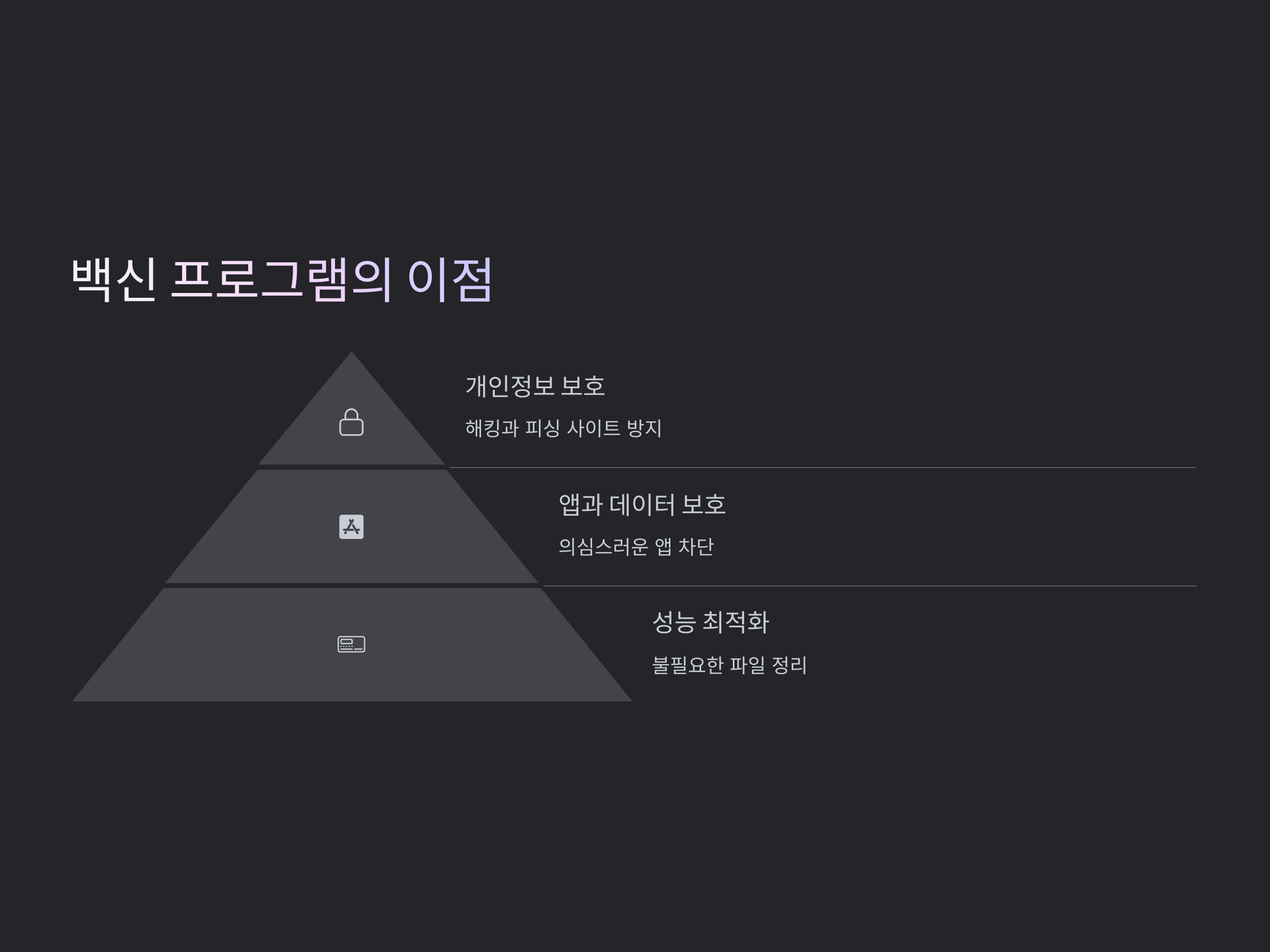 백신 프로그램을 설치하면 단순히 바이러스나 악성코드로부터 스마트폰을 보호하는 것 외에도 다양한 이점을 얻을 수 있습니다. 아래는 백신 프로그램을 사용했을 때 얻을 수 있는 주요 이점들입니다.