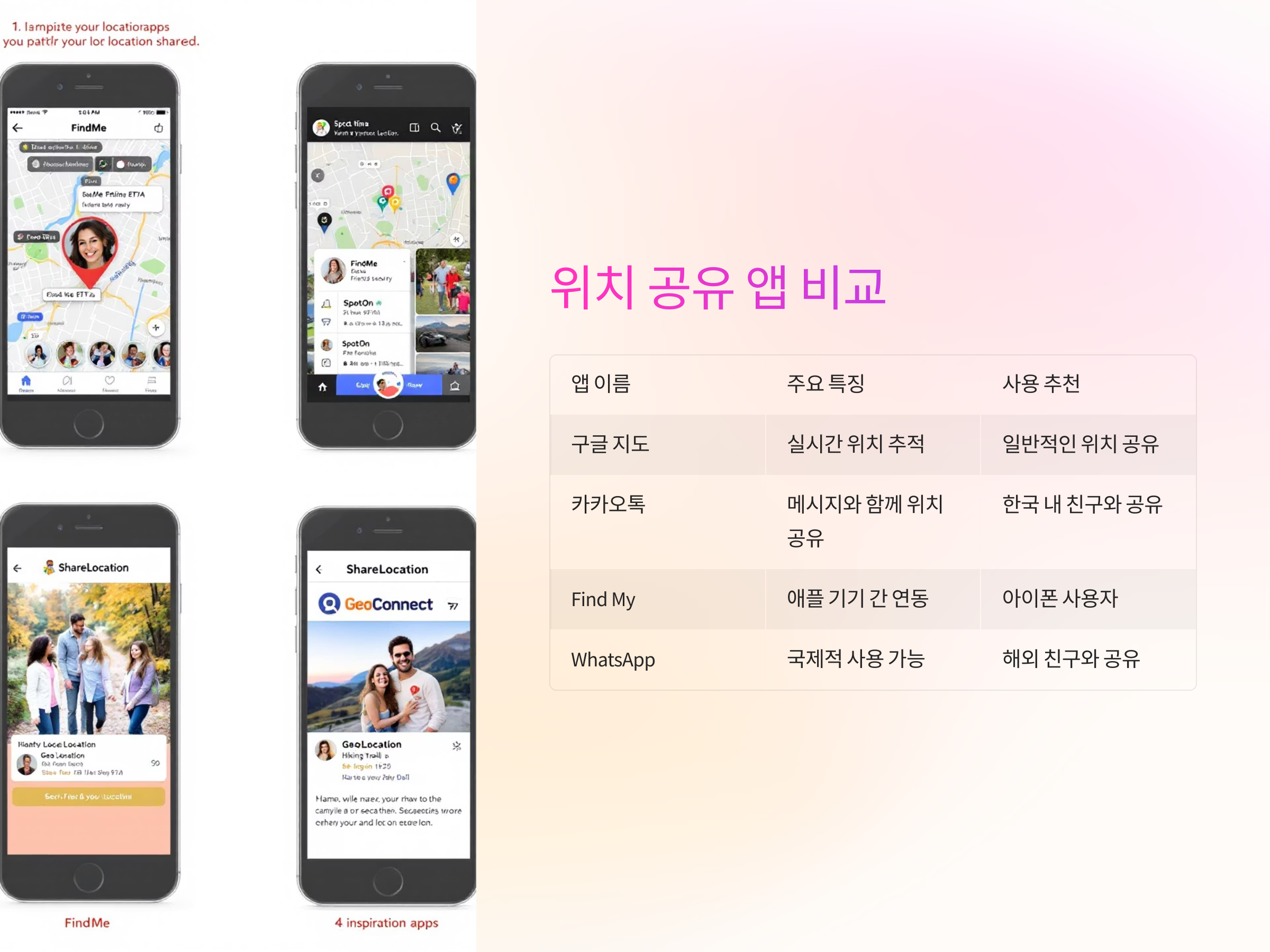위치를 공유할 사람을 선택하거나, 링크를 통해 위치를 공유할 수 있습니다. 'Find My' 앱은 특히 아이폰 사용자가 서로 위치를 쉽게 추적할 수 있게 도와줍니다.