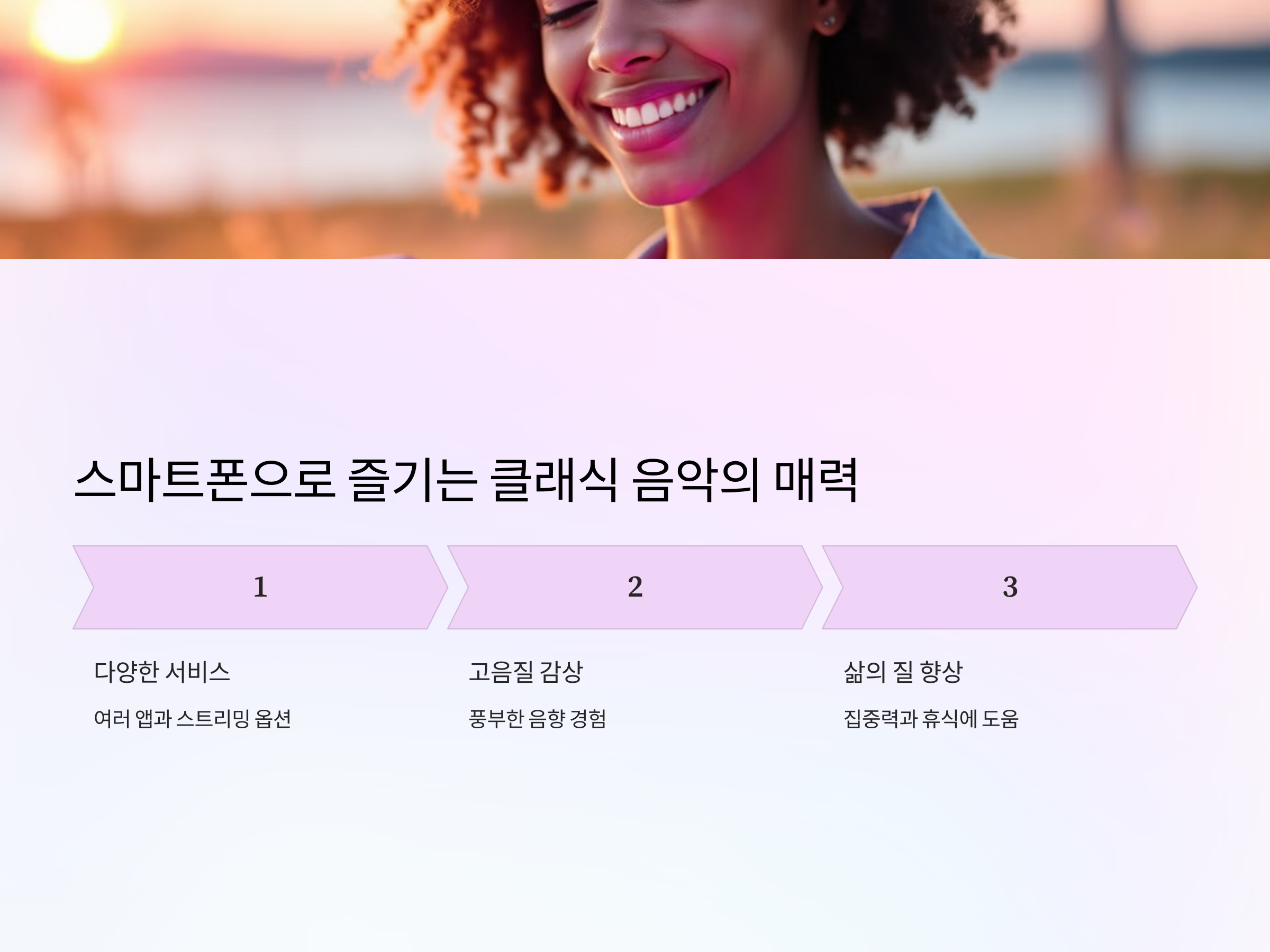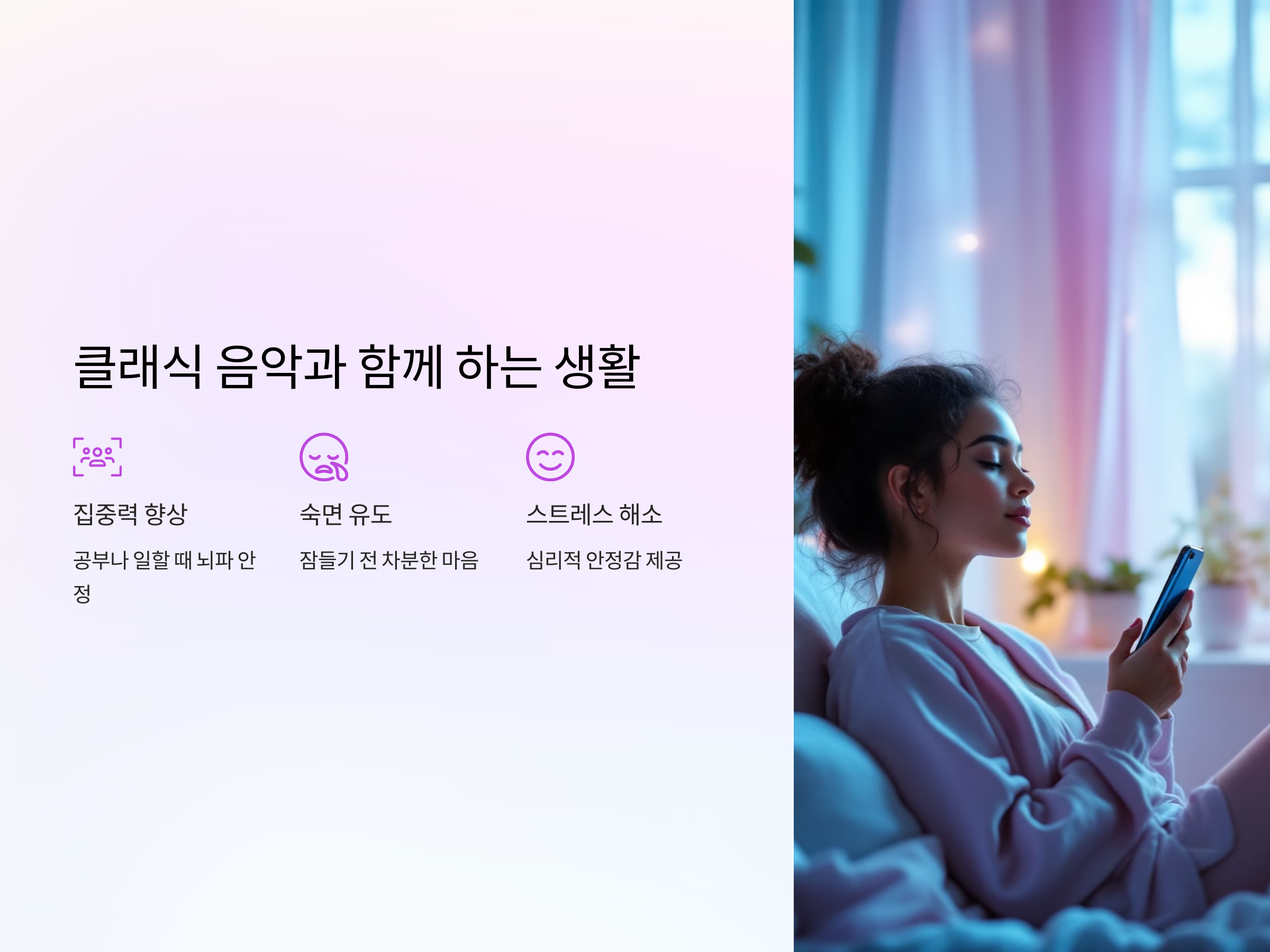 클래식 음악은 일반적으로 스트레스 해소와 집중력 향상에 효과적인 것으로 알려져 있습니다. 스마트폰으로 클래식 음악을 들으면서 공부나 일을 할 때, 뇌파가 안정되어 더 집중할 수 있게 도와줍니다. 클래식 음악의 부드럽고 고요한 선율은 스트레스를 줄여주고, 심리적인 안정감을 제공합니다.
