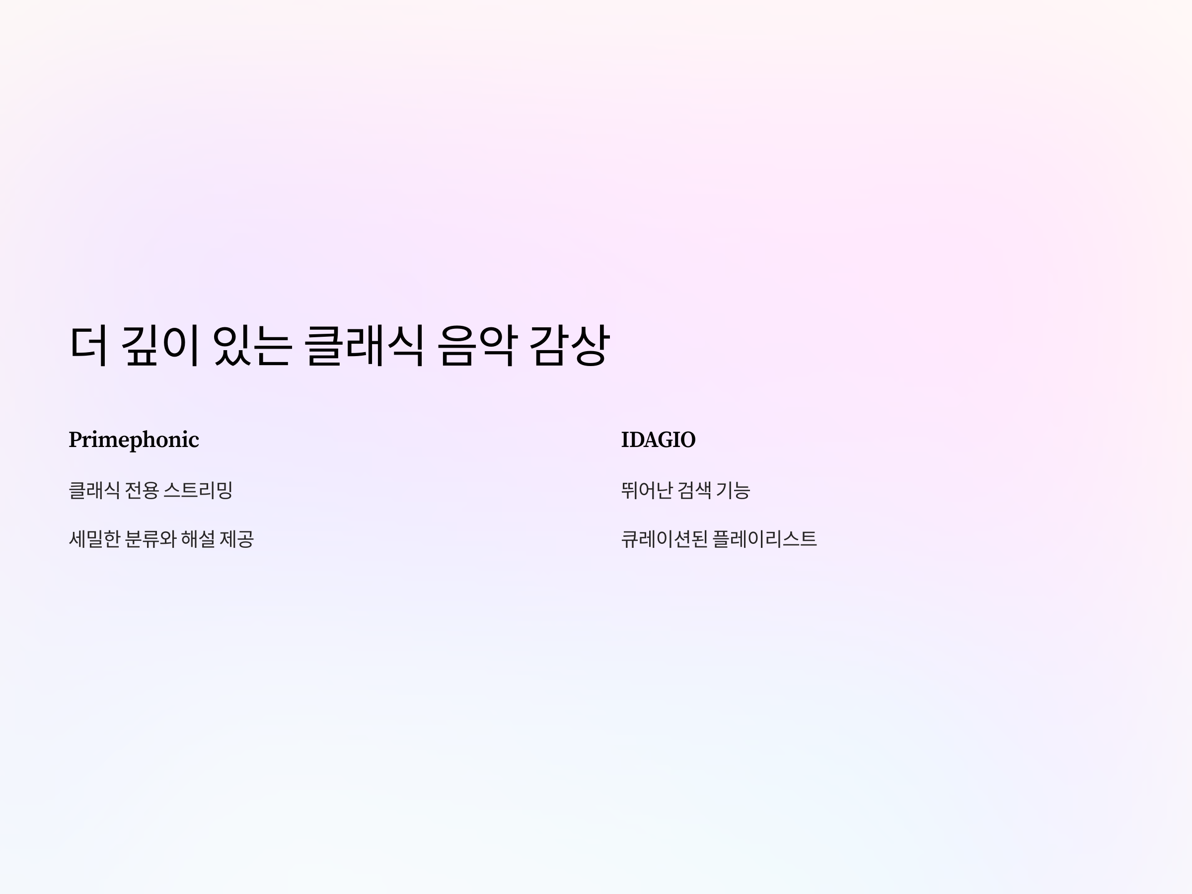 Primephonic은 클래식 음악을 위한 전용 스트리밍 서비스로, 클래식 음악을 사랑하는 사람들에게 특히 추천됩니다. 이 앱은 음질이 뛰어나며, 클래식 음악을 분류하는 방식을 세밀하게 나누어 쉽게 원하는 음악을 찾을 수 있습니다. 또한, Primephonic은 해설과 함께 클래식 음악을 제공하여, 음악을 감상하는 동안 그 배경 지식도 함께 습득할 수 있습니다.
