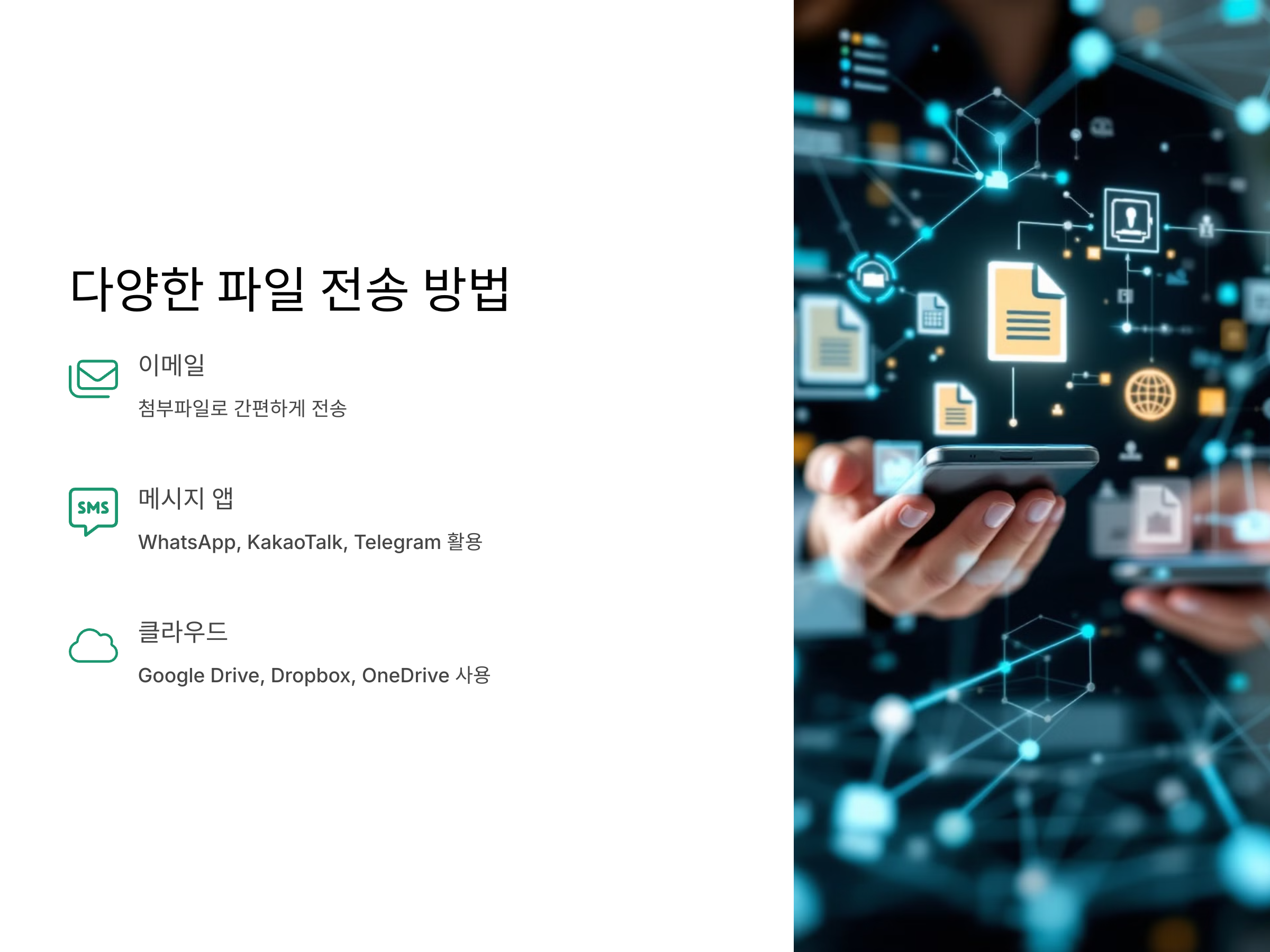 클라우드 서비스는 파일을 온라인 상에 저장하고 공유하는 매우 효율적인 방법입니다. Google Drive, Dropbox, OneDrive와 같은 클라우드 서비스는 스마트폰에서도 쉽게 사용할 수 있습니다. 파일을 클라우드에 업로드한 후, 공유 링크를 상대방에게 보내면 손쉽게 파일을 전송할 수 있습니다.